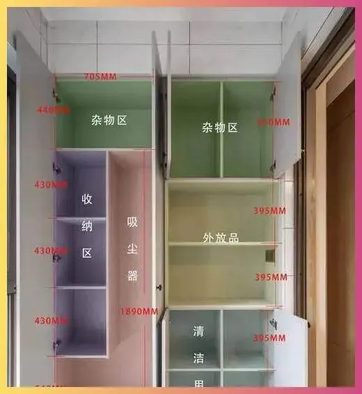 其次是通风问题。家政柜里放的都是清洁用品、湿漉漉的拖把,如果不通风,时间一长绝对会发霉、长毛。所以百叶门或者打孔的设计就特别重要,别省这个钱。还有,柜子底部最好架空几公分,让空气能流通。