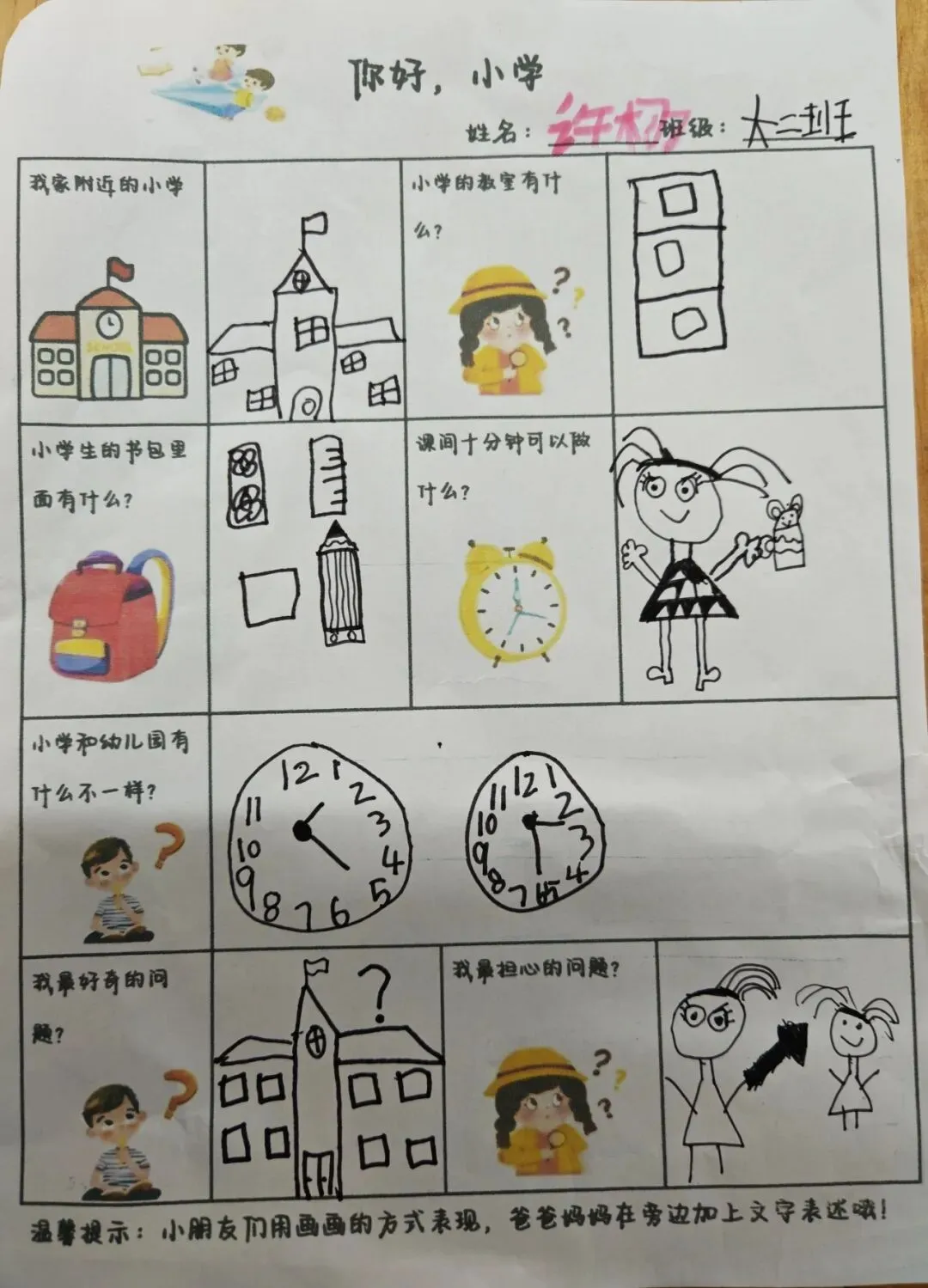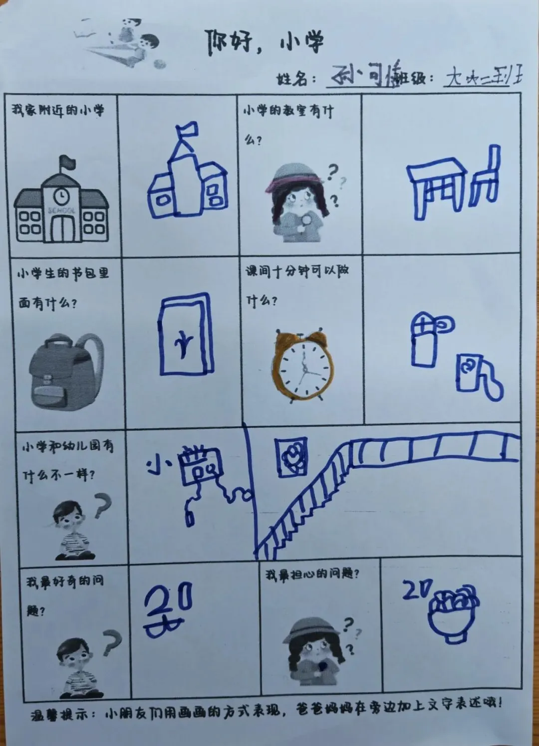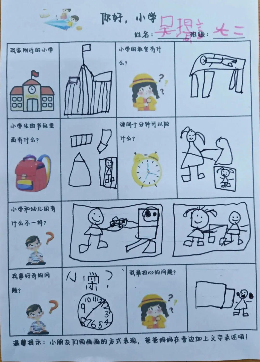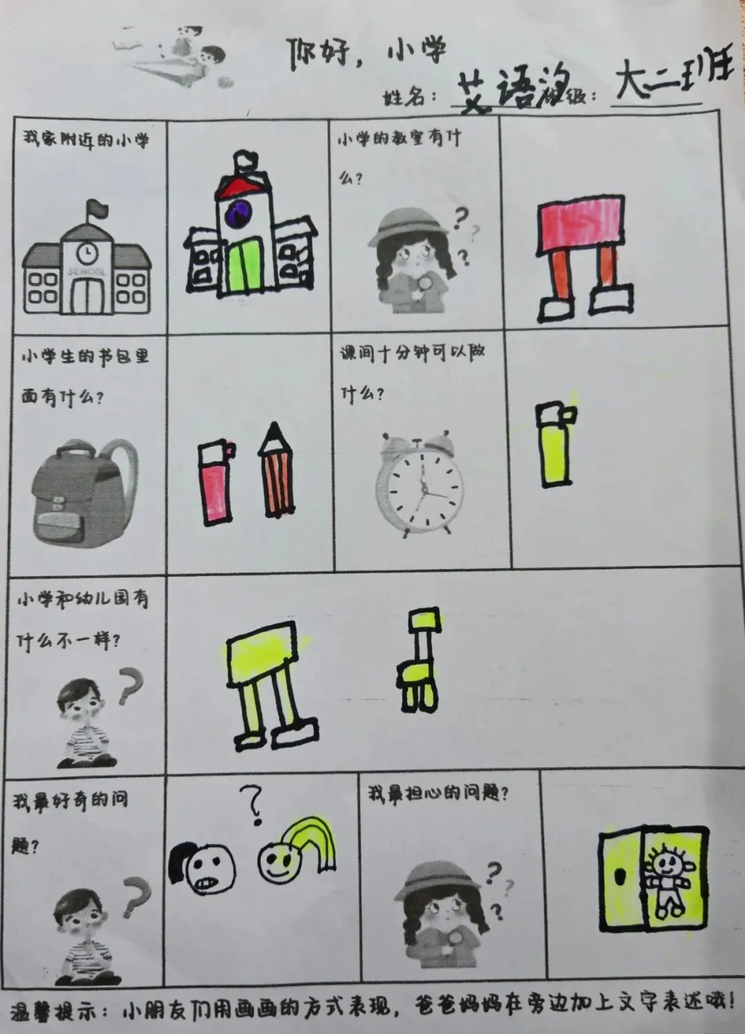 在调查中,孩子们认真探索着小学的模样:有的孩子仔细描绘着家附近的小学校园,有的画出了想象中教室里的黑板与课桌椅,还有的在书包里填满了课本、铅笔和橡皮。他们用稚嫩的笔触,勾勒出对课间十分钟的憧憬,也认真思考着小学与幼儿园的不同,勇敢写下自己最好奇、最担心的问题。