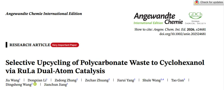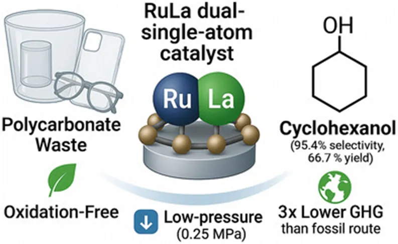 利用两级加压固定床反应器,研究将PC解聚制备环己醇。所得气、液、固三相产物分布如图3a所示。在所有测试催化剂中,液相产物占主导地位,产率约为70%,气相和固相产物各占15%左右。液相产物的详细分布如图3b所示,在无催化剂条件下液相产物以酚类化合物为主且无环己醇生成,证实PC解聚蒸气中本征含有高反应活性的含氧芳香中间体,可直接作为加氢反应底物。引入CoAl-MO载体催化剂对产物分布几乎无影响,产物仍以酚类为主,仅检测到微量环己醇。La-SA催化剂结果相近,环己醇产率略升至2.4%,但体系仍以酚类占主导。Ru-SA催化剂可显著促进环己醇生成,产率提升至15.2%,但酚类仍为主要产物。而RuLa-DA催化剂完全抑制酚类化合物生成,环己醇产率高达69.9%,表明反应路径显著转向生成饱和环己醇及其衍生物。对PC分解的主要初始产物苯酚与目标最终产物环己醇的选择性详细分析结果显示(图3c),苯酚选择性从非催化条件下的94.3%持续下降,在RuLa-DA催化剂作用下几乎完全被抑制;而环己醇选择性大幅提升至95.4%,比产率约为114 mg h-1 mgcat-1,证实RuLa-DA催化剂能够精准调控反应路径,实现芳香环完全加氢且保留羟基,在低压条件下即可实现高选择性加氢。实际消费后聚碳酸酯废料对RuLa-DA催化剂评估(图3d)结果显示典型商用PC废料均可稳定获得62%-64%左右的环己醇产率,选择性均高于95%。不同商用产品间的差异极小,表明消费级PC中的常见添加剂与结构差异不会显著影响催化性能。此外,不同PC产品混合后仍能实现同样高的产率与选择性,说明该催化体系可直接处理混合PC废料,无需预先分拣。上述结果共同表明RuLa-DA催化剂具有强稳定性与广泛适用性。采用间歇进料、连续反应策略将PC废料周期性加入一级反应器进行加氢热解,RuLa-DA催化剂固定在二级反应器中进行气相加氢。体系经100个进料循环仍可稳定获得约62%的环己醇产率,选择性保持在95%以上(图3e),证明RuLa-DA催化剂在接近工业的连续化条件下具有优异的长周期稳定性。
