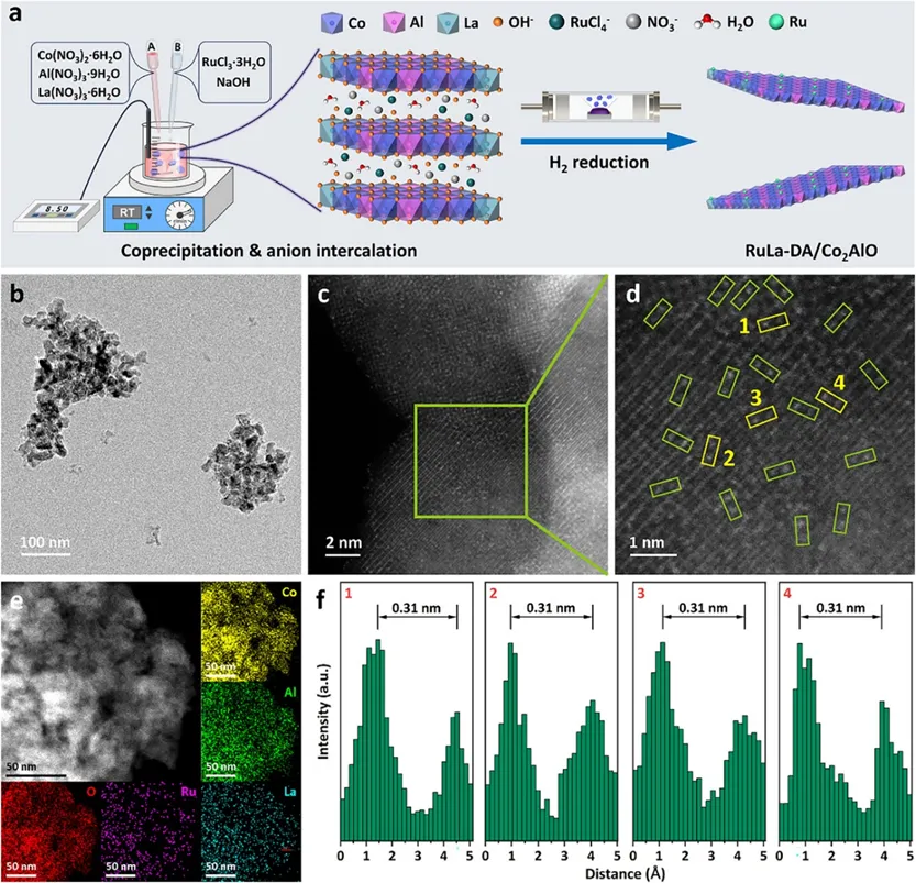 Figure 1. Structural characterization of the RuLa dual single-atom catalyst on CoAl mixed oxide. (a) Schematic of the synthesis strategy involving co-precipitation of La-doped CoAl-LDH, anion intercalation of RuCl4−, and H2 thermal reduction to obtain RuLa-DA. (b) TEM image of the nanosheet morphology. (c) HR-TEM image showing lattice fringes with an interplanar spacing of 0.31 nm. (d) AC HAADF-STEM image highlighting isolated Ru and La atoms with higher atomic contrast. (e) EDS elemental mapping of Co, Al, O, Ru, and La distributions. (f) Intensity profiles of selected atomic pairs, showing consistent spacing of ∼0.31 nm and confirming discrete dispersion of Ru and La atoms.