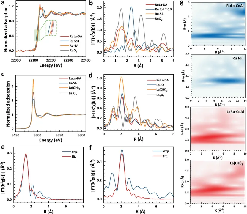 Figure 2. Electronic structure and coordination environment of Ru and La in the RuLa dual single-atom catalyst. (a) Ru K-edge XANES spectra of RuLa-DA, Ru-SA, RuO2, and Ru foil. (b) Corresponding FT-EXAFS spectra in R-space. (c) La L3-edge XANES spectra of RuLa-DA, La-SA, La(OH)3, and La2O3. (d) FT-EXAFS spectra at the La L3-edge. (e, f) Quantitative EXAFS fitting results for Ru and La in RuLa-DA. (g) Wavelet transform (WT) plots showing Ru and La coordination environments based on k and R resolution.