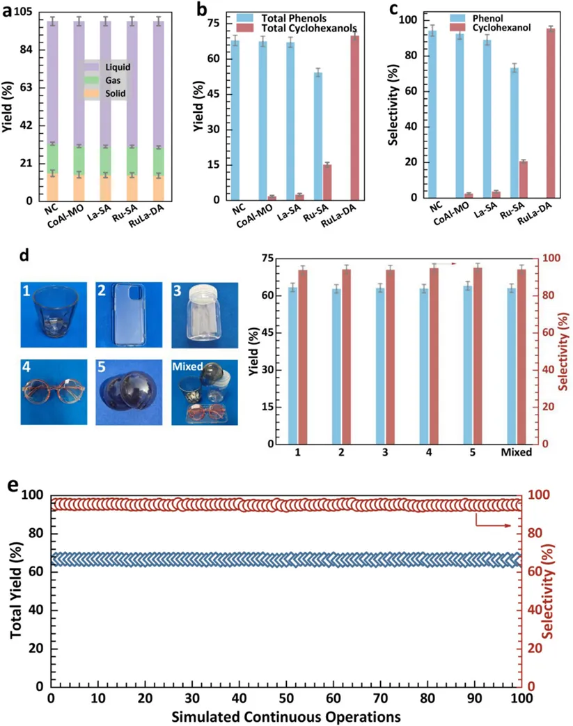 Figure 3. Tandem hydropyrolysis-gas-phase hydrogenation of waste polycarbonate over different catalysts. (a) Mass balance of gas, liquid, and solid fractions from tandem conversion of PC using different catalysts. (b) Liquid-phase yields of total phenolic and total cyclohexanol products. (c) Product selectivity toward phenol and cyclohexanol. (d) Hydrogenation performance using post-consumer colored PC sheets (red, yellow, blue, green, brown, and mixture) as feedstocks. (e) Catalyst stability evaluation over 100 consecutive intermittent feed cycles. All reactions were conducted in a dual-stage fixed-bed reactor at 550 ℃ (first-stage hydropyrolysis) and 200 ℃ (second-stage hydrogenation) under 0.25 MPa H2, with 10 mg catalyst and a hydrogen flow rate of 70 mL min−1 (STP). All yield and selectivity data are reported as the mean of three independent experiments (n = 3), with error bars representing the standard deviation (SD).