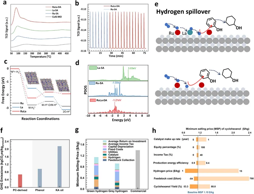 Figure 4. Dual-site hydrogen activation and spillover mechanism over RuLa-DA catalyst. (a) H2-temperature-programmed desorption (TPD) profiles of Ru-SA, La-SA, and RuLa-DA. (b) H2-pulse chemisorption profiles. (c) DFT-calculated free energy changes (ΔG) for H2 adsorption and *H formation on different catalysts. (d) Calculated d-band centers for Ru and La in Ru-SA, La-SA, and RuLa-DA. (e) Proposed hydrogen spillover pathway on RuLa-DA and Ru-SA. (f) Gate-to-gate greenhouse gas (GHG) emission boundaries for converting waste polycarbonate to cyclohexanol, compared with fossil-derived phenol and KA oil. (g) Minimum selling price (MSP) estimation for cyclohexanol under both hydrogen scenarios. (h) Sensitivity analysis of the MSP of cyclohexanol in the PC-to-cyclohexanol process.