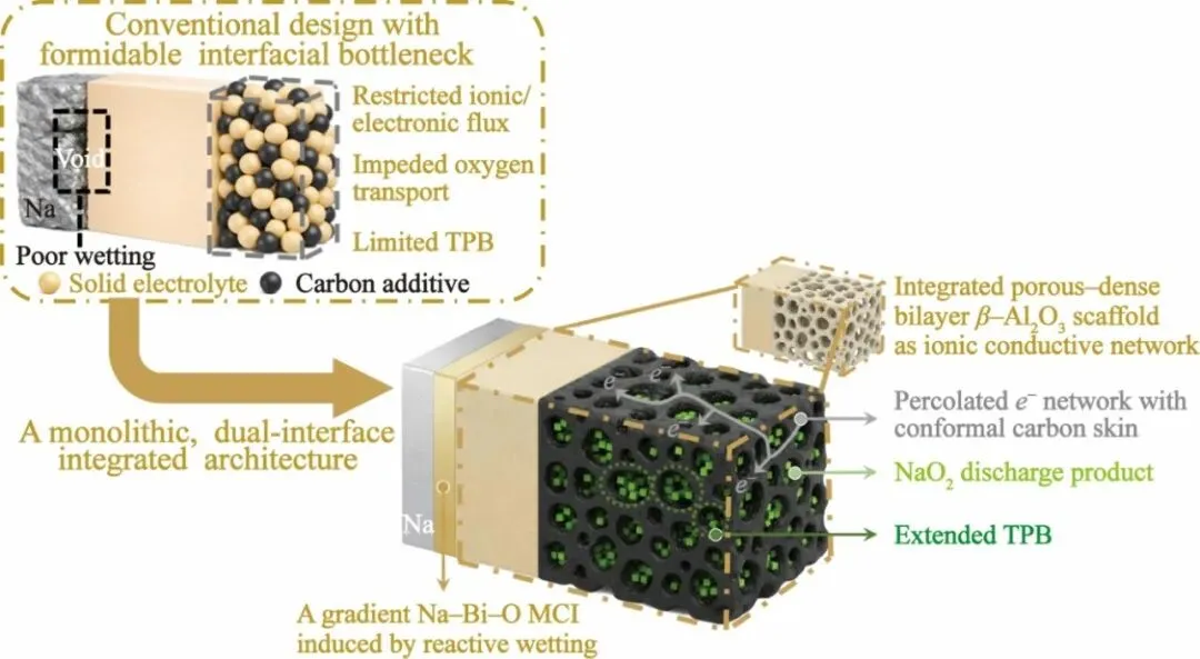 全固态钠氧(Na−O2)电池的发展,从根本上受到固-固界面强大的化学力学和动力学壁垒的限制。本文报道了一种基于整块双层β-氧化铝架构的高性能室温全固态钠氧电池,通过双界面集成策略重新定义了界面电荷转移。