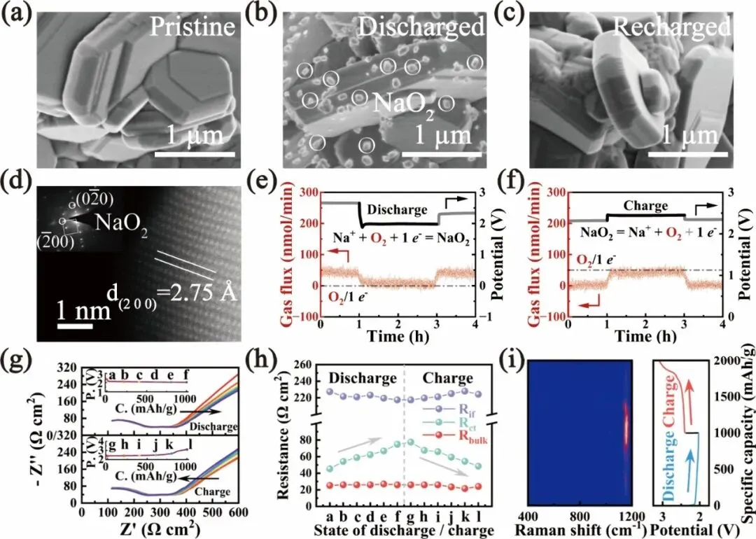 图5 | 全固态Na−O2电池的机理分析。(a-c) 阴极形貌演变的扫描电镜表征:(a) 原始态、(b) 完全放电态、(c) 再充电态阴极的俯视扫描电镜图;(d) 放电产物的原子级结构识别:放电产物的高分辨STEM图,插图为对应选区电子衍射图;(e,f) 原位气体演化动力学:(e) 放电和(f) 充电过程中的DEMS分析;(g) 界面动力学演化:不同放电充电状态下的原位EIS谱;(h) 体相电阻(Rbulk)、界面电阻(Rif)和电荷转移电阻(Rct)的演化;(i) 原位拉曼光谱显示NaO2信号(~1154 cm−1)的出现和消失,未检测到Na2O2