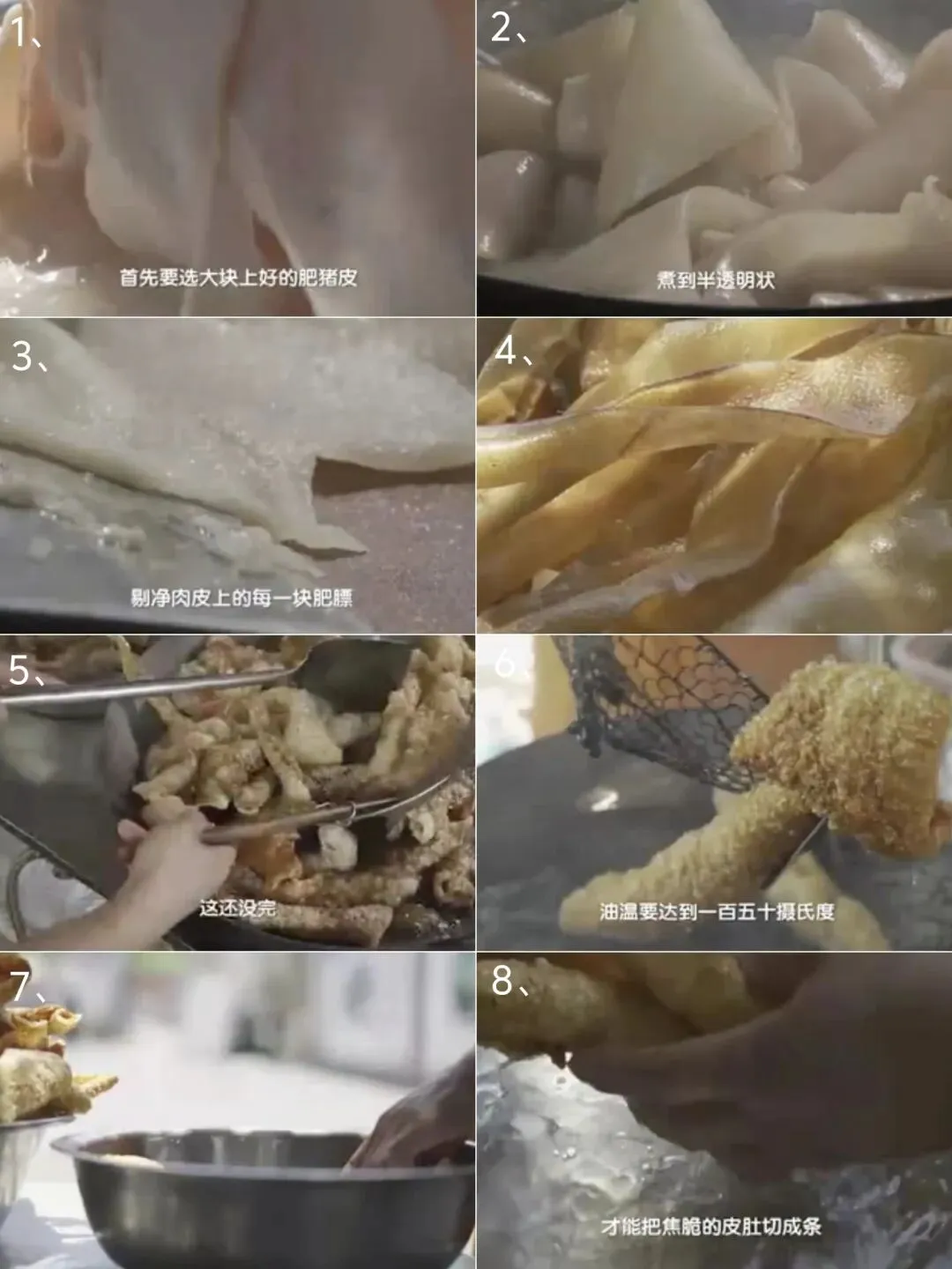 风干好的肉皮要在油锅里经过两次炸制,第一次六十到七十度温油炸制,第二次一百五十度热油炸制,这样的话作出来的皮肚才会蓬松均匀,吃起来才好吃。炸好的皮肚还不能直接进行煮制,还要用清水浸一下,变软后切成条才可以用来制作皮肚面。