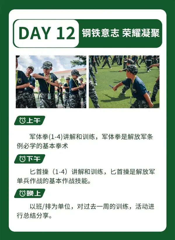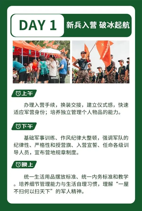 服装:配发两套军装、帽子、水壶、腰带、结营证书(结营可带走);
