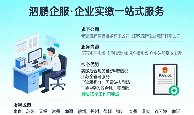 泗鹏企服旗下:无锡泗鹏信息技术有限公司、江苏泗鹏企业管理有限公司,服务江苏全域(南京 / 苏州 / 无锡 / 常州 / 南通 / 徐州 / 扬州 / 盐城 / 镇江 / 泰州 / 淮安 / 连云港 / 宿迁),专注无形资产实缴、专利实缴、注册资本实缴,全程代办无需法人到场,最快 15 个工作日落地,合规免征 6% 增值税。江苏企业有实缴需求,可私信领取专属城市实缴方案!