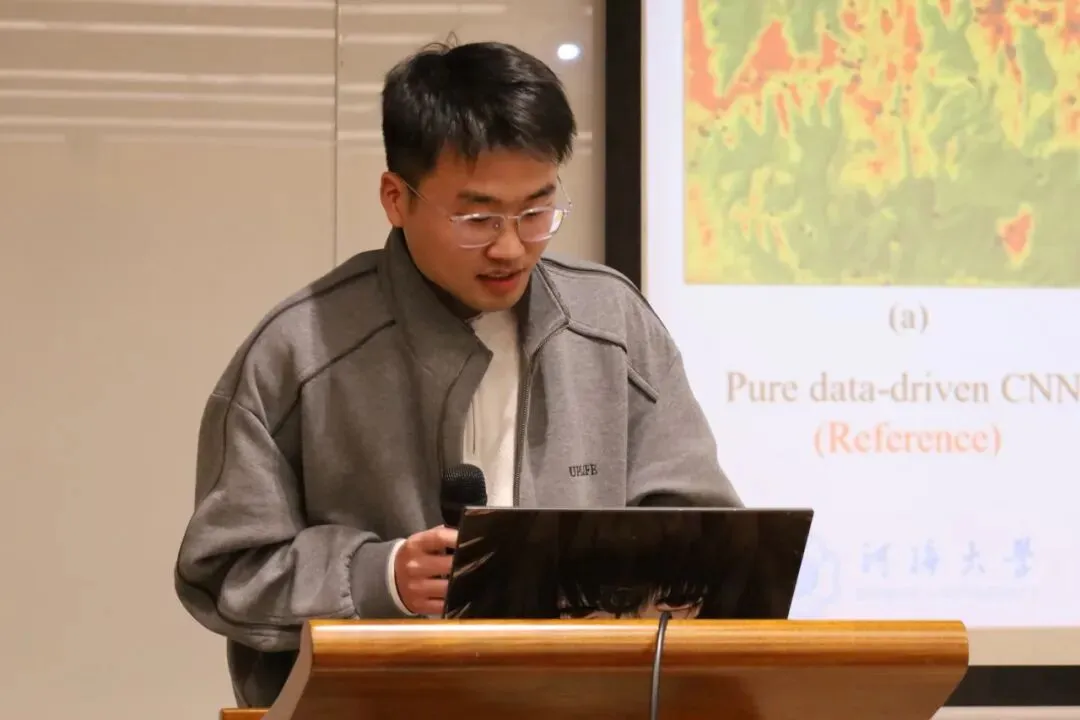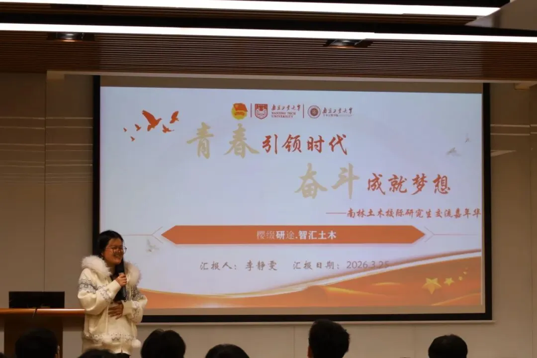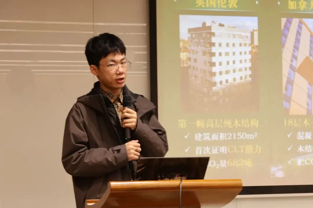 活动以学术交流为开篇,聚焦土木工程领域前沿课题。河海大学博士研究生谢善尧,以《区域滑坡易发性预测的物理-数据混合驱动新模型》为题,汇报展示了区域滑坡易发性预测模型的最新研究成果。南京林业大学研究生李叡,以“竹木交融,固碳先锋”为题,探讨了可持续生物质复合建材减碳、净碳、固碳新技术。