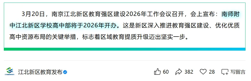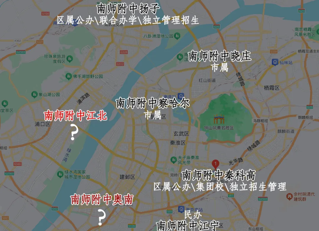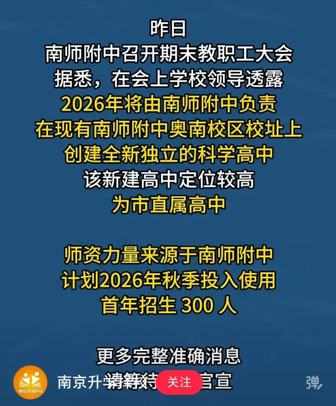 3月20日,南京江北新区教育强区建设2026年工作会议召开,会上宣布:南师附中江北新区学校高中部将于2026年开办。同时执行校长由附中秦科高原执行校长徐国民担任。计划中,江北这所南师附中为30班初中+45班高中的规模,结合江北新区教育强区建设2026年的工作计划,南师附中此次应该是高中先行。同时还将建成开办南外江北新区学校、南京一中浦口分校、浦外高新小学侨康路分校共4所优质学校:南外:滨江实验学校,包括一所6轨36班小学和一所10轨30班初中,项目位于江北核研创园板块;南京一中浦口分校:学校规划4轨24班小学、8轨24班初中,项目位于浦口城南中心;多所学校的到来,也意味着2026年将是江北新区深入推进教育强区建设的关键一年。项目位于江北核心区,旁边即为金陵江月,与正荣润锦城、金基山川江樾隔七里河而望。这个位置,堪称江北核极为核心且优质的位置,一旦9月份正式开学,江北核将自一中之后,再度迎来顶级高中教育资源。南师附中察哈尔、南师附中晓庄、南师附中奥南、南师附中秦科高、南师附中江宁分校以及最新的南师附中江北。去年9月份,南师附中晓庄校区正式启用,旨在扩大附中招生规模,与察哈尔路校区同一代码招生(不同分数线),并与奥南校区共同构成“一校三区”一体化管理模式,实现管理一体、师资一样、教学一致,切实保障教育质量的高位均衡。不论是察哈尔还是晓庄,都是南京高中天花板,招生分数线站稳塔尖。但对于全新的南师附中江北,目前从介绍中却能看出,和“本部”会有区别:“南京师范大学附属中学校长朱焱在会上表示,南师附中将依托深厚文脉底蕴与优质教育资源,全力支持新区打造特色教育品牌,助力南师附中江北新区学校成为新区教育高质量发展的亮丽名片。”“未来,学校也将秉承附中办学理念,深耕课堂,精研育人,着力打造高品质高中教育平台。”推测:合作办学、区属、独立、特色高中。(以官方消息为准)秦科高,区属公办四星级高中,南师附中集团成员校,但独立招生管理,且是全省第一所以“科技”冠名的高中。重点是,除了秦科高,南京今年还将迎来另一所“特色”南师附中高中——今年年初有网络消息称,2026年南师附中将在现有的奥南校区校址上创建全新独立的科学高中,且为市直属高中,师资力量来源于南师附中,计划今年秋季投入使用,首届招生300人。(此为网络消息,请以官方消息为准)奥南校区,一直一校三区一体化办校,但却并没有独立的学校代码,奥南校区所有学生填报志愿时,都是填的南师附中察哈尔路校区的相应代码,学校一直是本部高一年级部分班级、国际班和空军青航校的学生就读。相对而言,奥南校区的“特色”其实已经明牌,就是“科学高中”。去年年初,中共中央、国务院印发了《教育强国建设规划纲要(2024—2035年)》里面就明确提出: