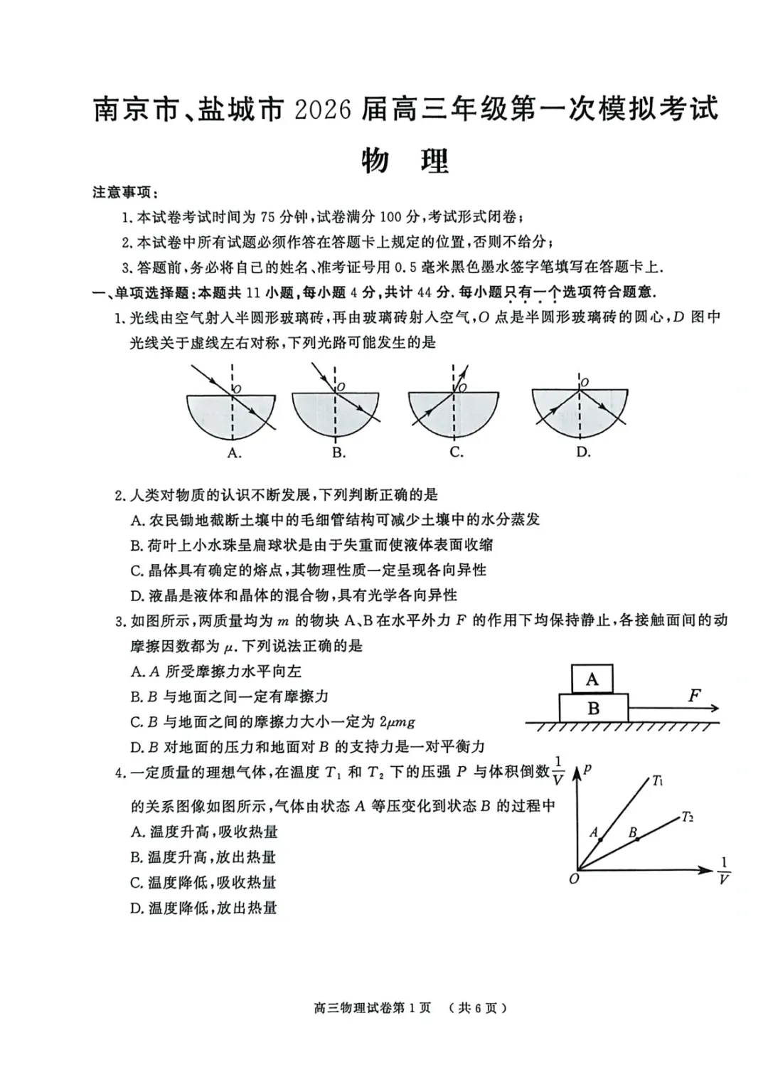 江苏省南京市盐城市2026届高三一模物理试卷及答案(2026.03) 《娄东物理-昆太志愿咨询 苏州县域领先》