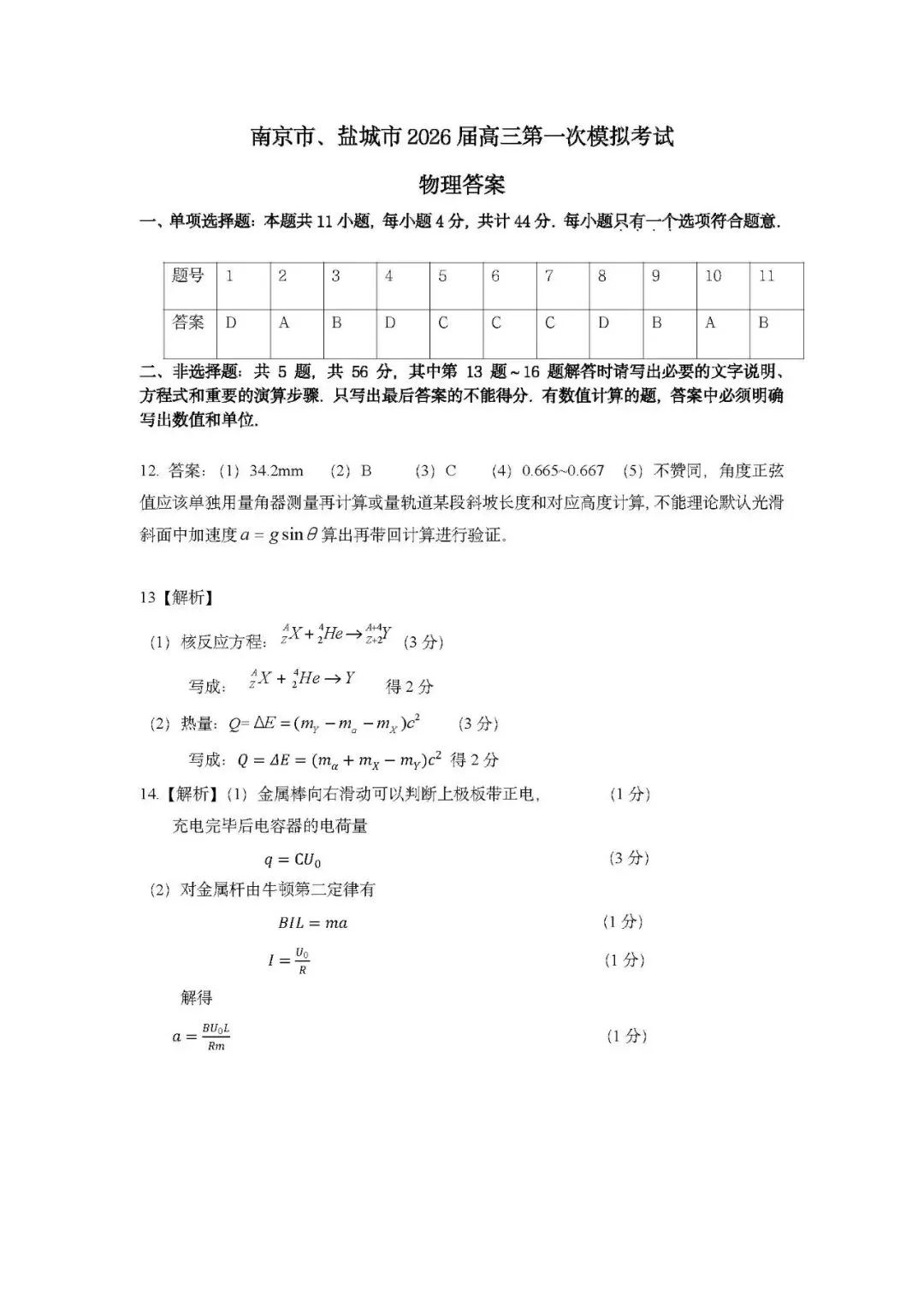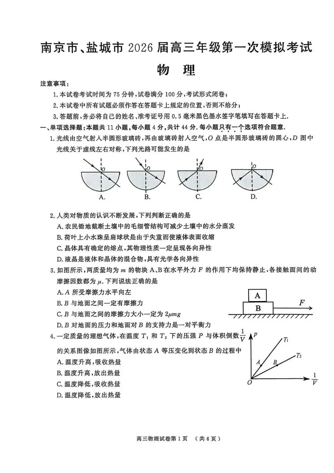 >南京市、盐城市2026届高三一模试题及参考答案
