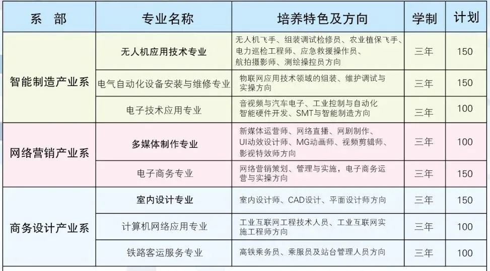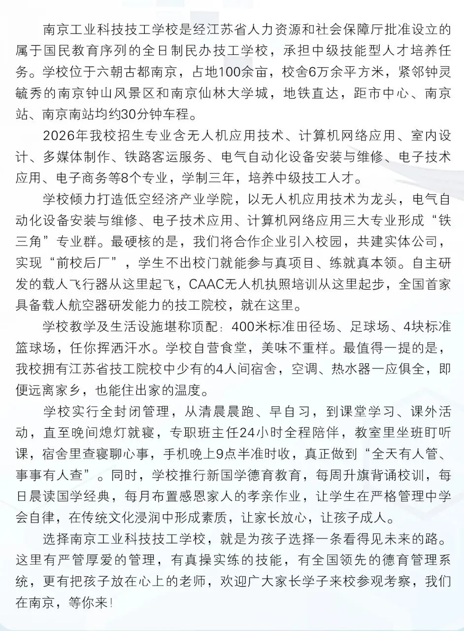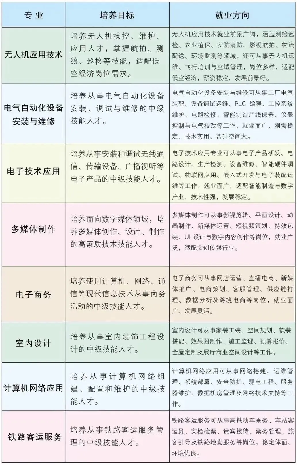我校倾力打造低空经济产业学院,以无人机应用技术为龙头,电气自动化设备安装与维修、电子技术应用、计算机网络应用三大专业形成“铁三角” 专业群。最硬核的是,我们将合作企业引入校园,共建实体公司,实现“前校后厂”,学生不出校门就能参与真项目、练就真本领。自主研发的载人飞行器从这里起飞,CAAC无人机执照培训从这里起步,全国首家具备载人航空器研发能力的技工院校。