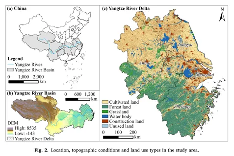 研究区为长江三角洲地区(YRD),涵盖上海市及江苏、浙江、安徽三省,总面积35.8万km²,常住人口2.37亿,人口密度为全国平均水平的4.5倍。该区域是中国经济最发达、城市化进程最快的地区之一,同时也是重要的粮食产区,耕地资源丰富但面临高强度利用与生态压力。