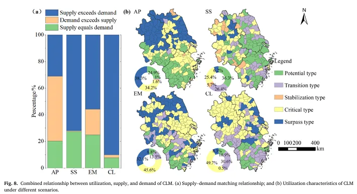 本研究以长三角地区为例,构建了“供给—利用—需求”耦合的自适应优化框架,系统诊断了耕地多功能性的空间分异与利用特征。结果表明:长三角耕地利用呈现“利用不均、供给充足、需求滞后”的格局,农业生产功能面临超载与潜力并存的“双重压力”,生态维护功能超载区占比高达32.1%。基于供需匹配关系,研究划分了五类利用特征与四级复合分区,提出了针对性优化策略——超载区推行绿色种植与生态休耕,潜力区发展都市农业与梯田改造,协同优化区建立横向补偿机制。研究为快速城镇化地区耕地资源的精细化管理与可持续利用提供了理论依据与实践路径。