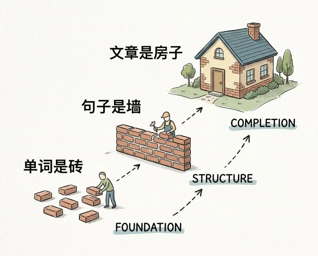 今天我就跟大家把这个问题说透,不绕弯子、不讲大道理,全是我平时教学里的真实观察和实在经验。其实核心问题很简单:单词是砖,句子是墙,文章是房子。孩子只攒了一堆砖,却不知道怎么砌成墙、盖成房子,背再多单词,也没法应对考试里的综合题型。