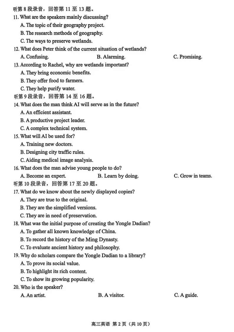 听力部分语速适中,情境真实,考查细节获取与推理判断能力,第10段独白信息密度较大,对短时记忆有一定要求。