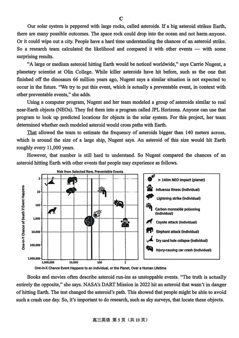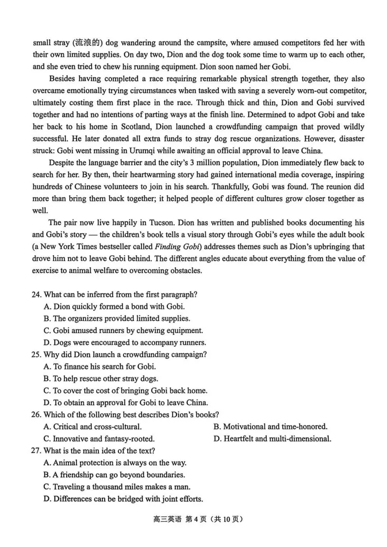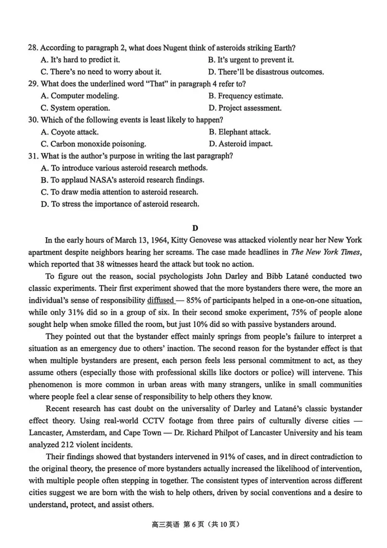 阅读理解选材多元,A篇为应用文,信息直观;B篇记叙文人狗情谊,情节清晰;C篇说明文涉及天文数据,图文结合,对信息整合能力要求较高;D篇论述“旁观者效应”的经典理论与新近研究,学术性强,对逻辑思辨能力有较高要求。七选五围绕“语音消息”展开,语境连贯,选项干扰度适中。