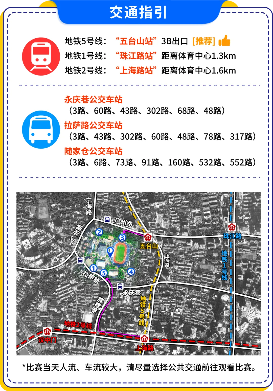 和去年5月、6月份的比赛相比,本周六来五台山体育场观赛的球迷可以享受到地铁5号线的实在便利,距离最近的五台山站3A、3B出口步行100米即可到达体育场3号门。此外,地铁2号线上海路站和公交3路、13路、48路、83路五台山站均可就近前往体育馆,建议前来健身运动的市民朋友同样尽量选择公共交通出行。