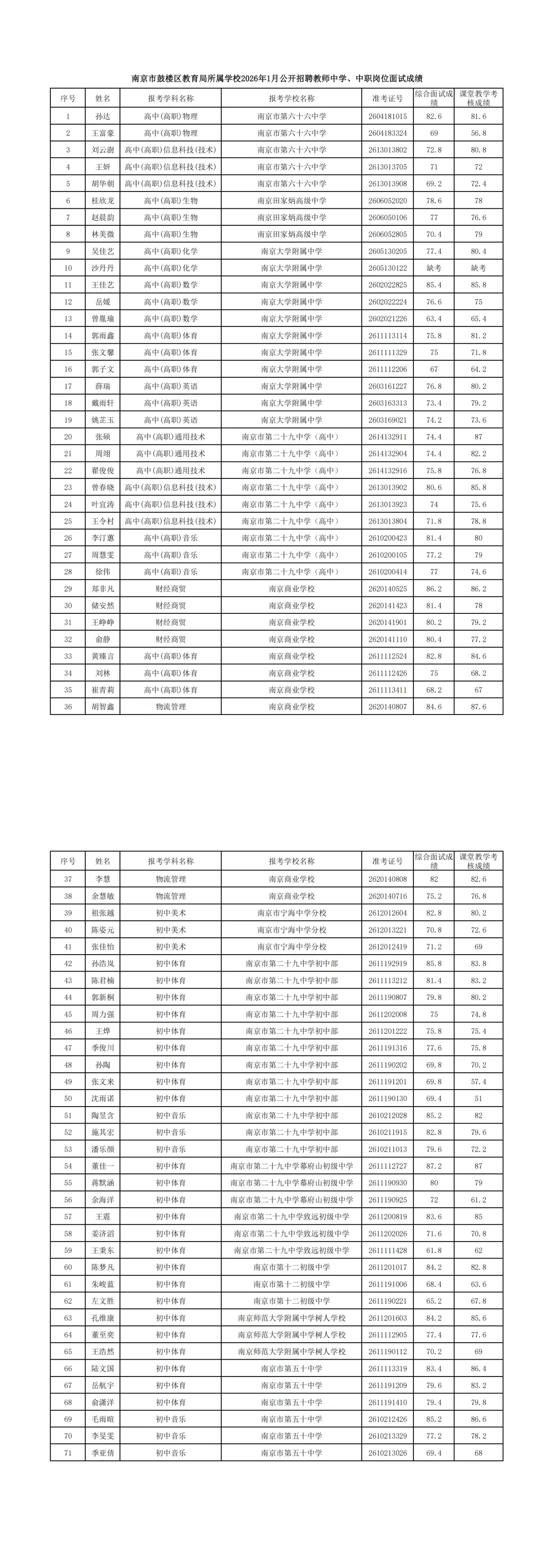 附件:南京市鼓楼区教育局所属学校2026年1月公开招聘教师中学、中职岗位面试成绩