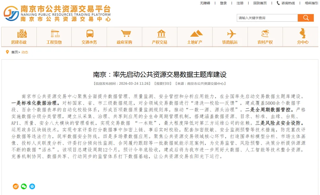 3月24号刚发的消息,南京率先启动公共资源交易数据主题库建设,年底就验收。一旦跑起来,你的每一次投标都会变成永久数据: