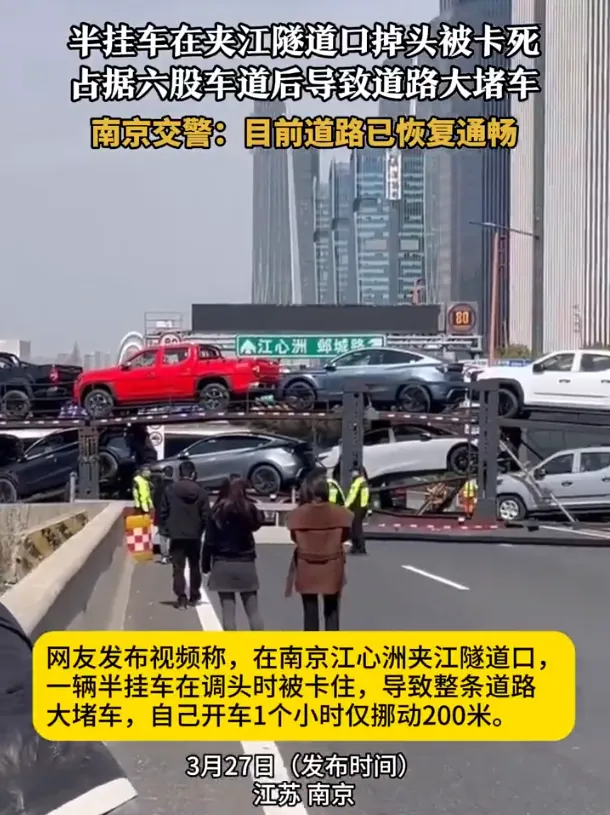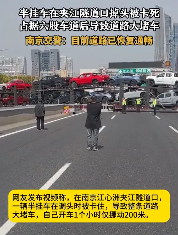 史诗级拥堵!南京一半挂车在夹江隧道口掉头时被卡住....