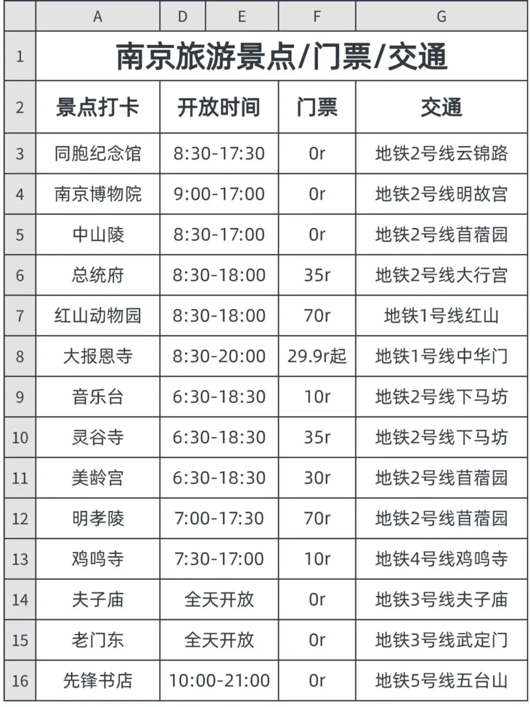 放假想去南京旅游的姐妹们!!这份攻略赶紧🐎码住 还有交通、住宿等全都是干货💪小白也可以放心抄作业😘祝大家玩的开心·🚶🏻♀️南京三天两夜计划Day1:同胞纪念馆-大报恩寺-老门东-夫子庙Day2:明孝陵-梧桐大道-南京博物院-新街口Day3:红山动物园-玄武湖-南京城墙-颐和路-先锋书店.✔️需要预约的景点:南京博物院:提前7天18:00🎫free同胞纪念馆:提前7天8:00🎫free中山陵:提前3天16:00🎫free总统府:提前2天0:00🎫35r