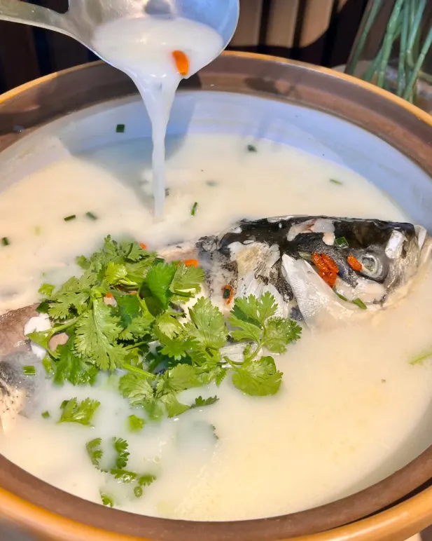 我最想单独说天目湖砂锅鱼头。做法其实不花哨,胖头鱼现杀,先煎到两面微黄,再进砂锅,配姜片、葱结、黄酒和开水,耐心炖。重点不是猛料,而是火候。汤要炖到发白发稠,鱼香才会慢慢融进去,最后撒一点白胡椒,就很够了。