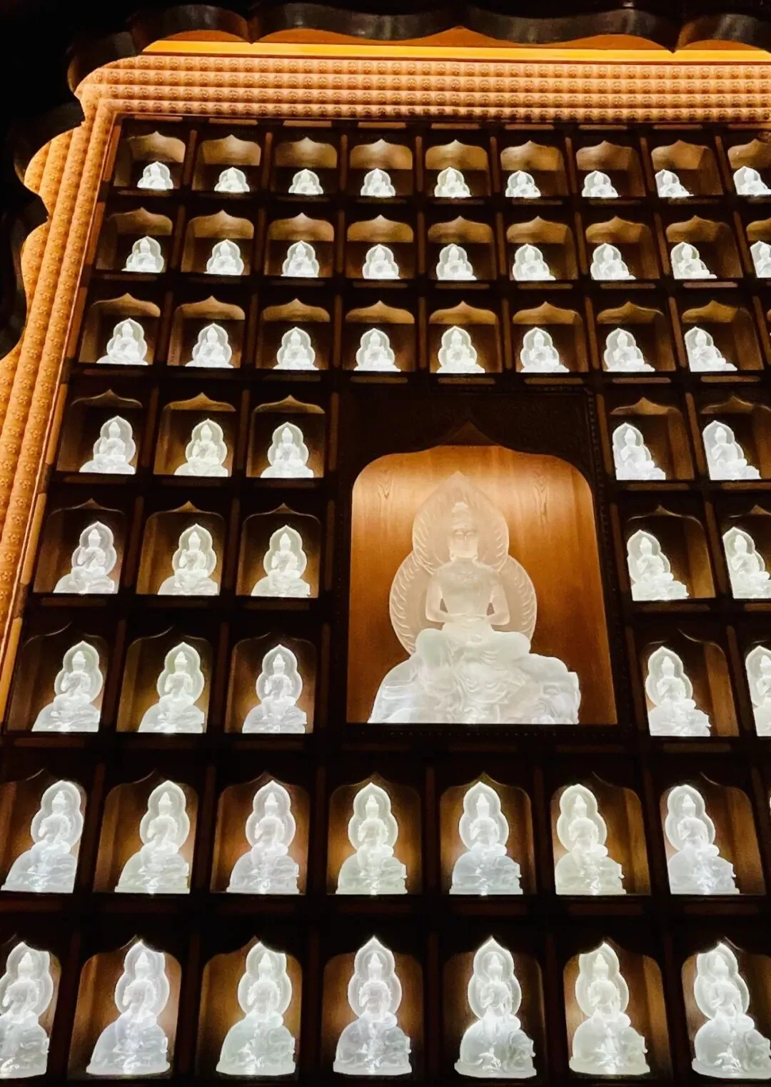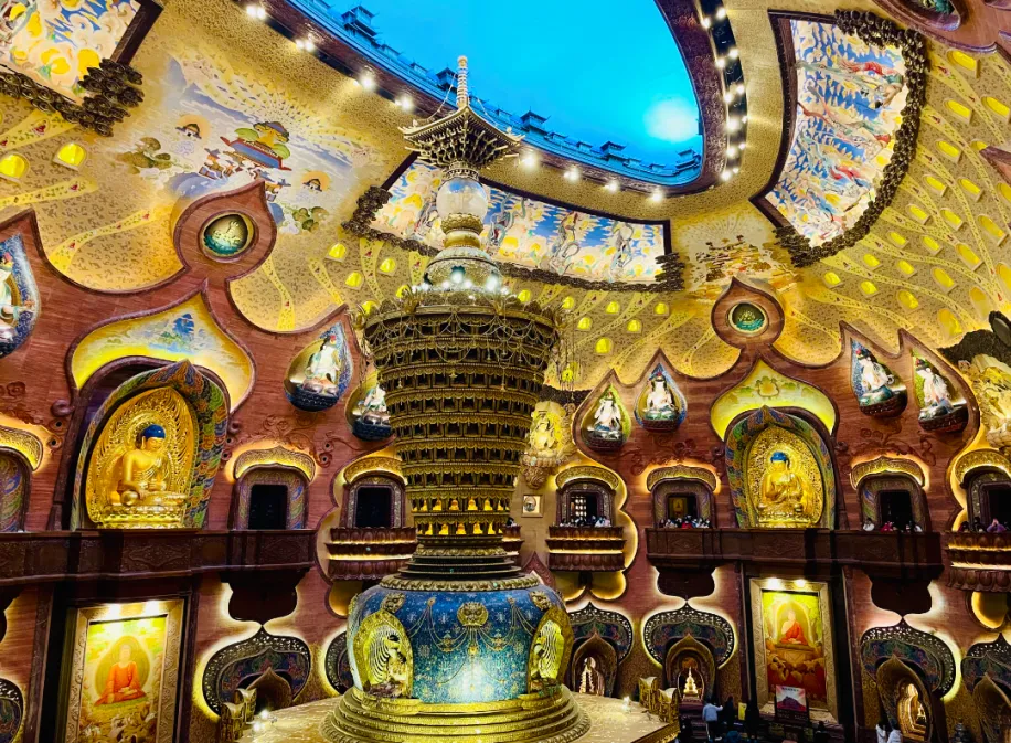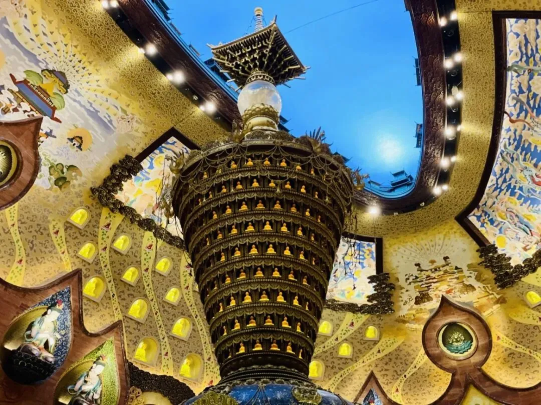 走入其中,空间豁然宏大。穹顶内侧的千佛窟层层环列,无数佛像静坐于壁龛之中,面容慈悲而平静。