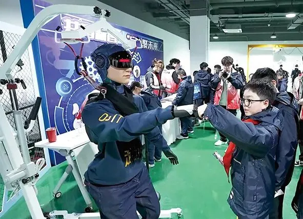 通用人形机器人“夏起”与软件谷小学学生碰拳华夏机器人(南京)有限公司供图
