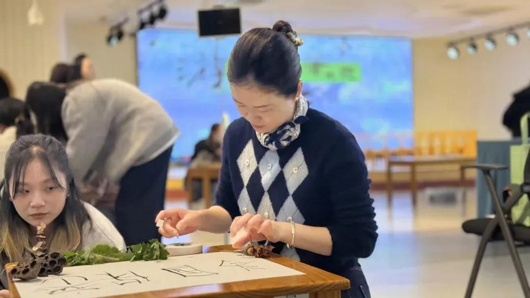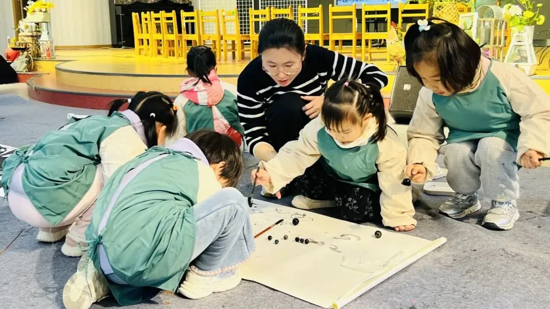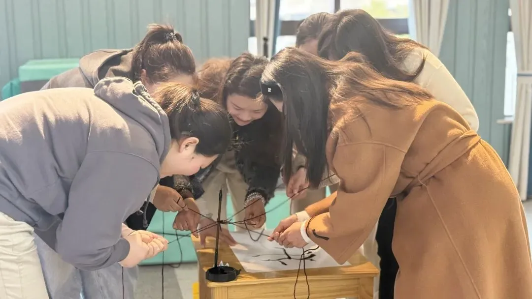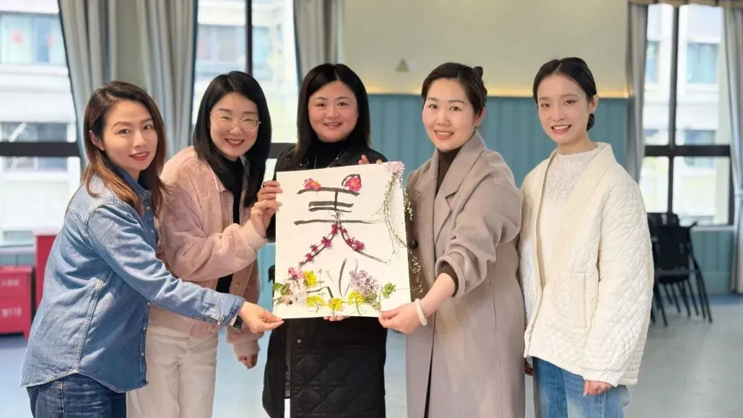 春光正好,老师们漫步九龙湖幼儿园,处处可见“以美育人”的巧思。签到参观后,一场别开生面的开场游戏拉开序幕:各组教师用多双手共同拉住绳子牵引一支画笔,在纸上书写“美”字,再以春花、柳条点缀。“以花为墨,以枝为笔”“春花烂漫,未来可期”……各组流淌出的不仅是一个“美”字,更是一份“至美至乐”的宣言——美在协作,美在专注,美在每一个为共同目标而努力的身影。