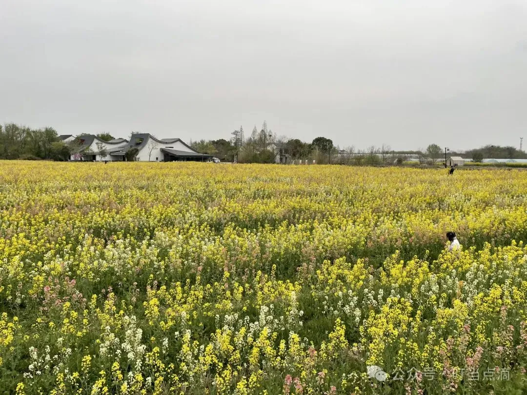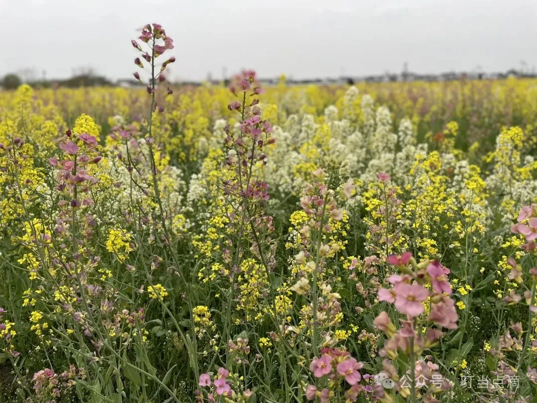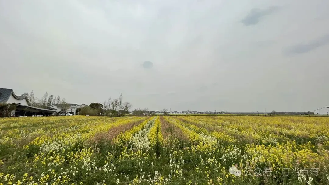 按着导航,驾车驶入乡间小路,我们一度怀疑是不是走错了,结果小路转过一排村舍,忽见千顷彩浪接天涌来。金蕊叠霞光,粉瓣凝胭脂,白英缀星子,恍若吴带当风遗落一卷泼彩画卷。远村黛瓦如墨点于花潮尽处,应了范石湖“日暮平原风过处,菜花香杂豆花香”的幽境。蜂阵嗡嘤穿行其间,恰似杨诚斋笔下“飞入菜花无处寻”的俏皮注脚。