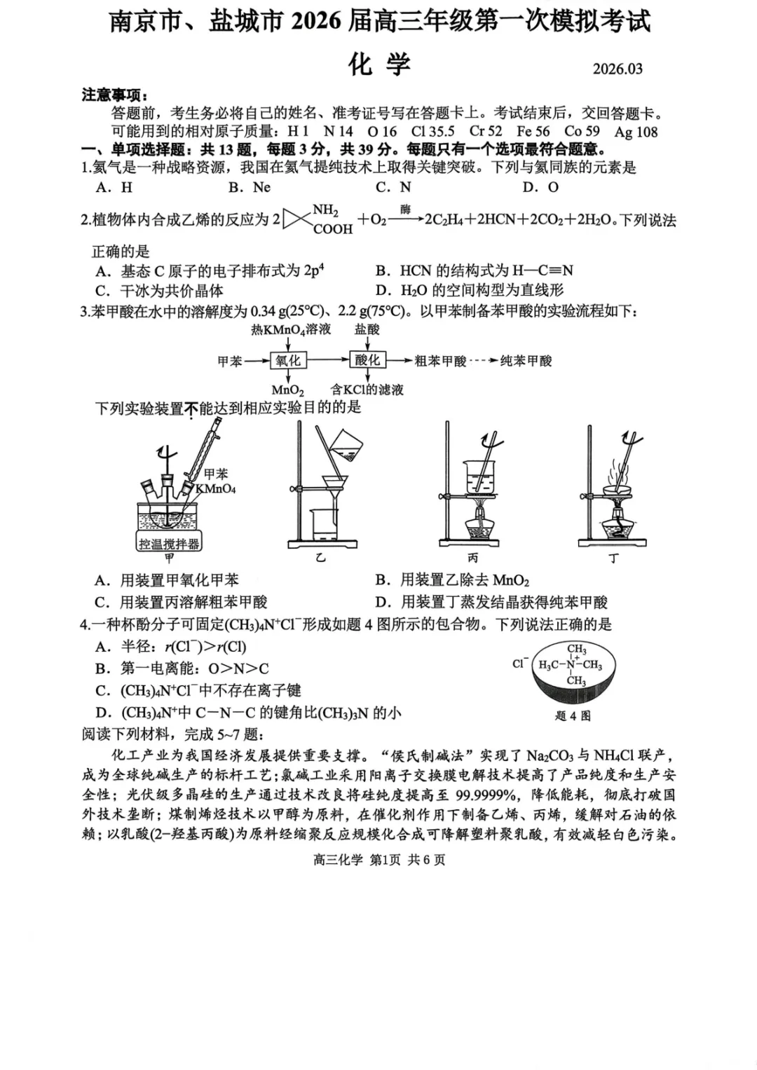 南京市、盐城市2026届高三年级第一次模拟考试【化学】试卷及答案