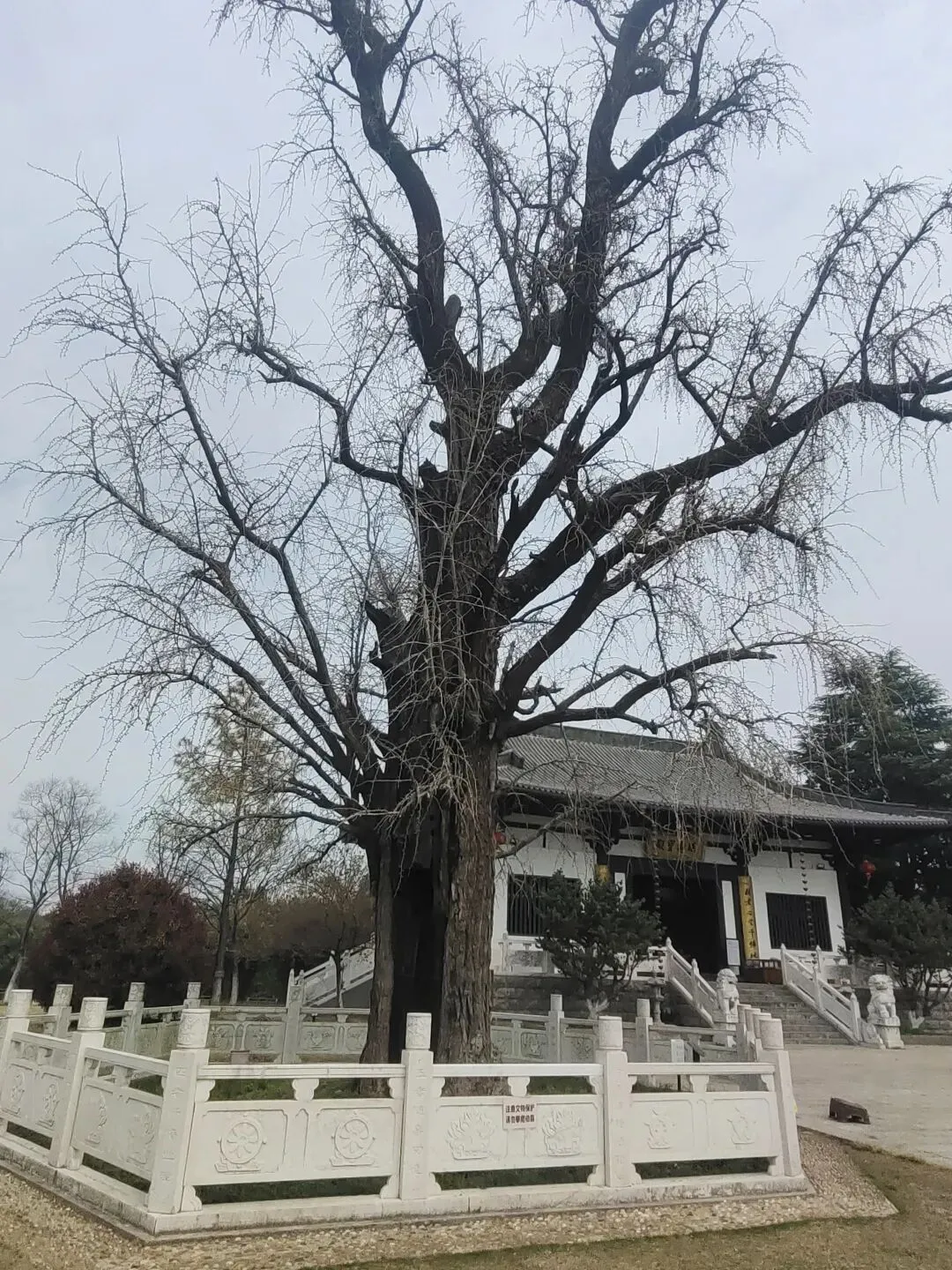 但难得的是,这座寺庙前的大片空地上留下了三棵树龄约1500年的银杏树,至今仍存活,简直不可思议。这三棵树形态各异,呈三足鼎立之势,人们为它们取了名字,千方百计加以守护,它们像‘神一样地存在着。