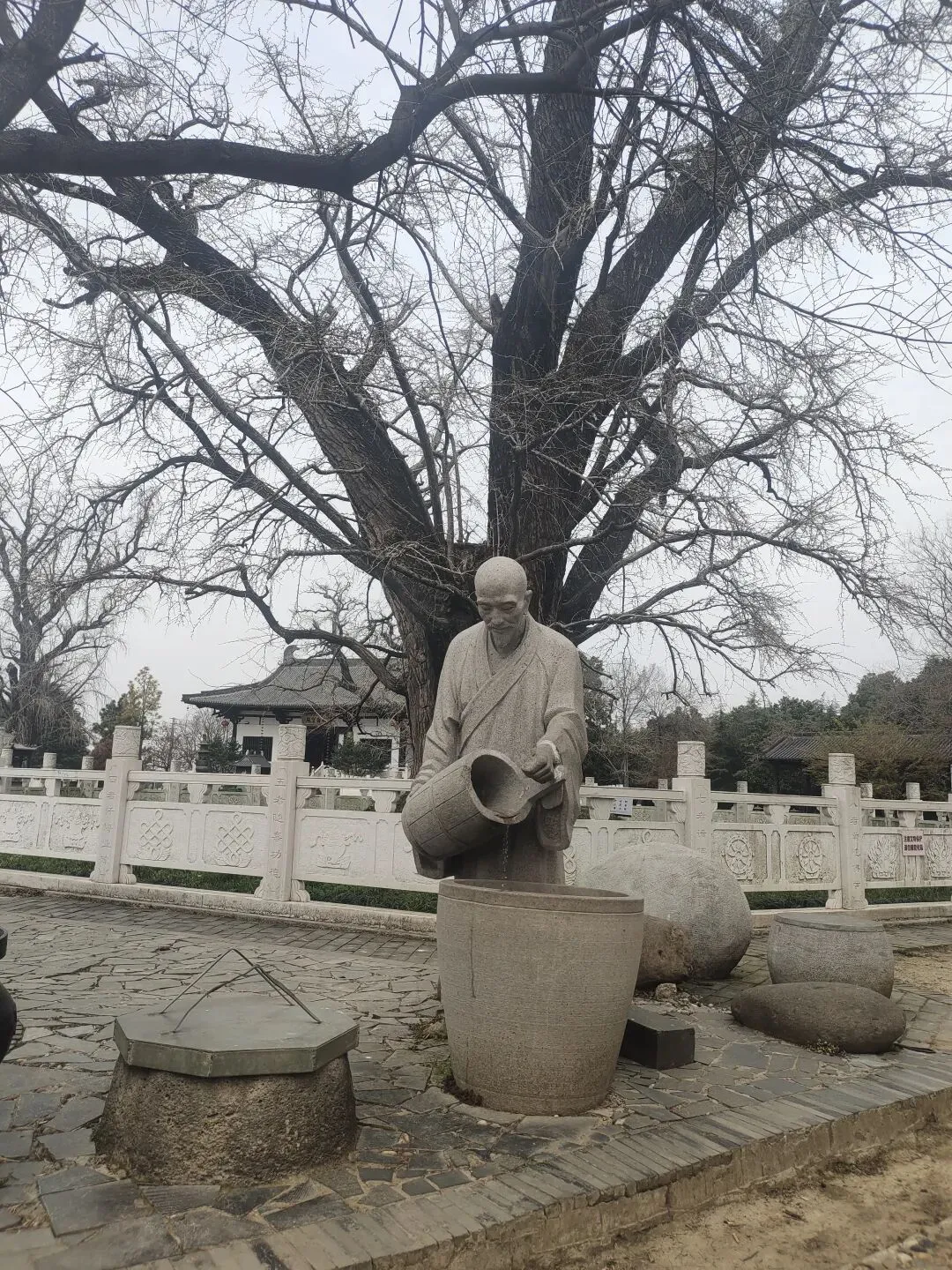 但难得的是,这座寺庙前的大片空地上留下了三棵树龄约1500年的银杏树,至今仍存活,简直不可思议。这三棵树形态各异,呈三足鼎立之势,人们为它们取了名字,千方百计加以守护,它们像‘神一样地存在着。
