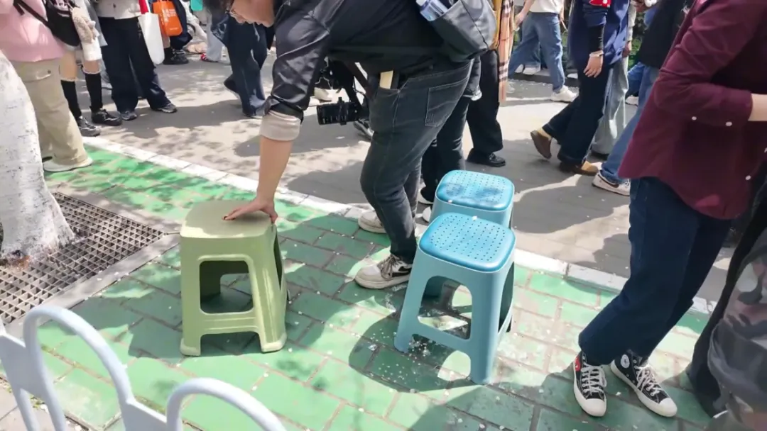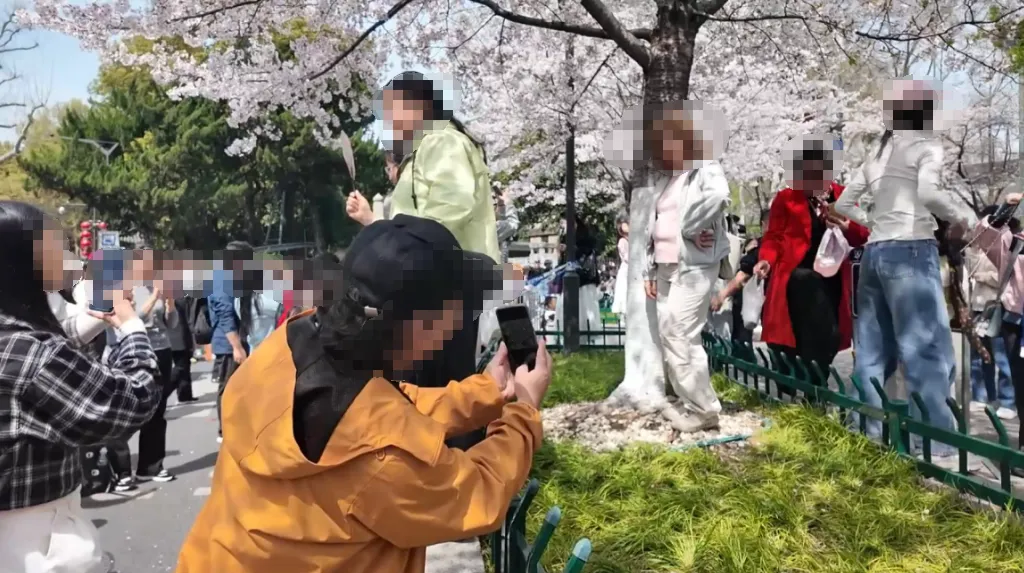 今天(3月28日),记者实地探访发现,虽然现场有大量商拍、直播从业者,但大部分人并没有进入核心管控区域。现场也确实有部分商拍从业者携带了凳子和折叠梯,但一旦占用道路或绿地,很快就被巡查的城管队员劝阻,对普通游客的影响并不大。