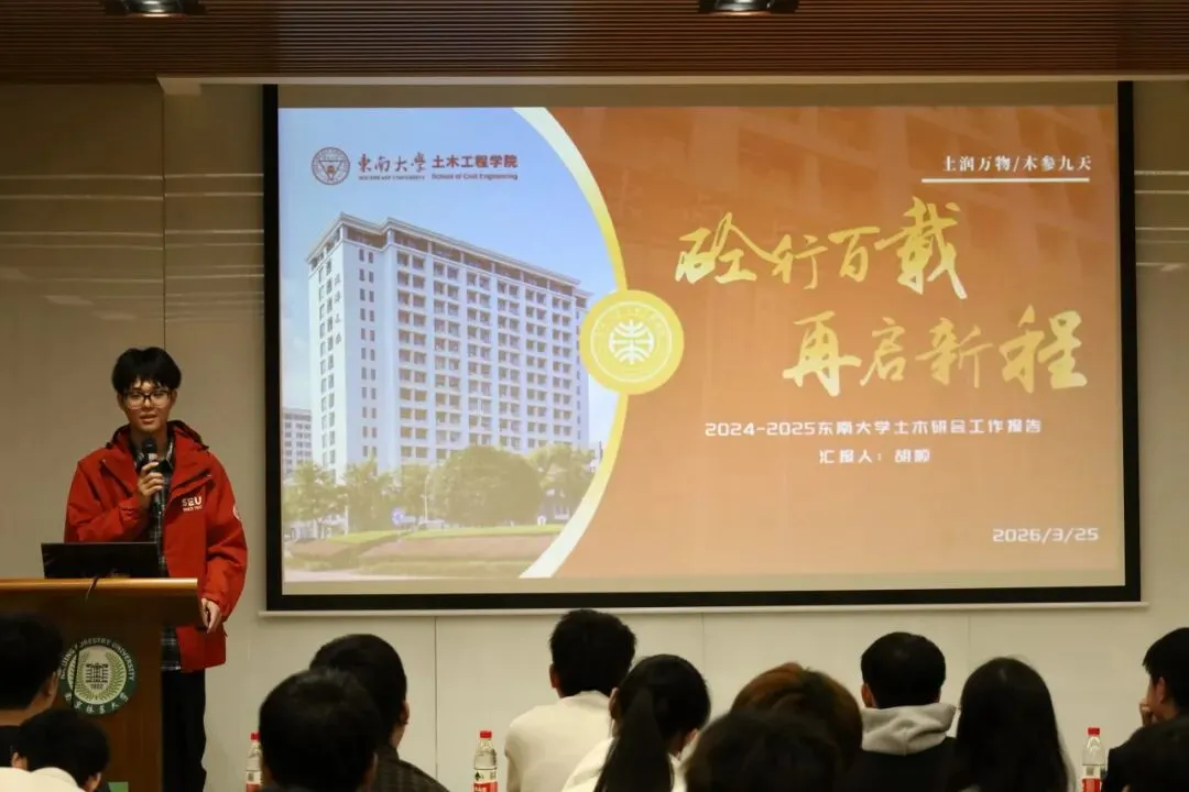 活动以学术交流为开篇,聚焦土木工程领域前沿课题。河海大学博士研究生谢善尧,以《区域滑坡易发性预测的物理-数据混合驱动新模型》为题,汇报展示了区域滑坡易发性预测模型的最新研究成果。南京林业大学研究生李叡,以“竹木交融,固碳先锋”为题,探讨了可持续生物质复合建材减碳、净碳、固碳新技术。
