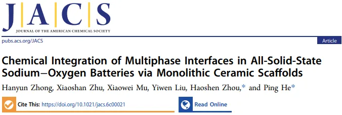 钠氧电池因其高理论能量密度和钠资源丰富、成本低廉的特点,被视为下一代储能技术的有力候选者。然而,传统液态钠氧电池面临电解液被超氧自由基分解、漏液及钠枝晶生长导致的安全隐患。全固态架构采用陶瓷电解质可规避这些问题,但固固界面接触差、阻抗高及力学失配等挑战严重限制了其发展。针对这些瓶颈,南京大学周豪慎和何平课题组在Journal of the American Chemical Society上发表研究,提出了一种基于整体式双层β-氧化铝陶瓷骨架的界面工程策略。该工作通过构建一体化多孔-致密结构,消除了电解质与阴极间的宏观物理边界,建立了无缝离子传导通道。同时,采用等离子体增强化学气相沉积技术在骨架上沉积保形石墨碳层,构建三维电子网络,并引入Bi2O3纳米片介导的反应润湿机制,在阳极侧形成梯度混合导电界面。这一设计从根源上改善了界面电荷转移效率,为全固态钠氧电池的性能提升提供了新思路。