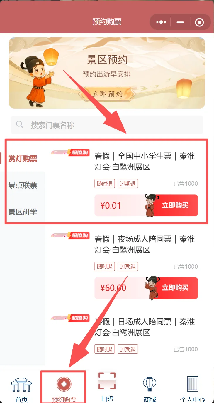 进入预约入口后,点击下方的“预约购票”;再选择0.01元的春假门票即可。