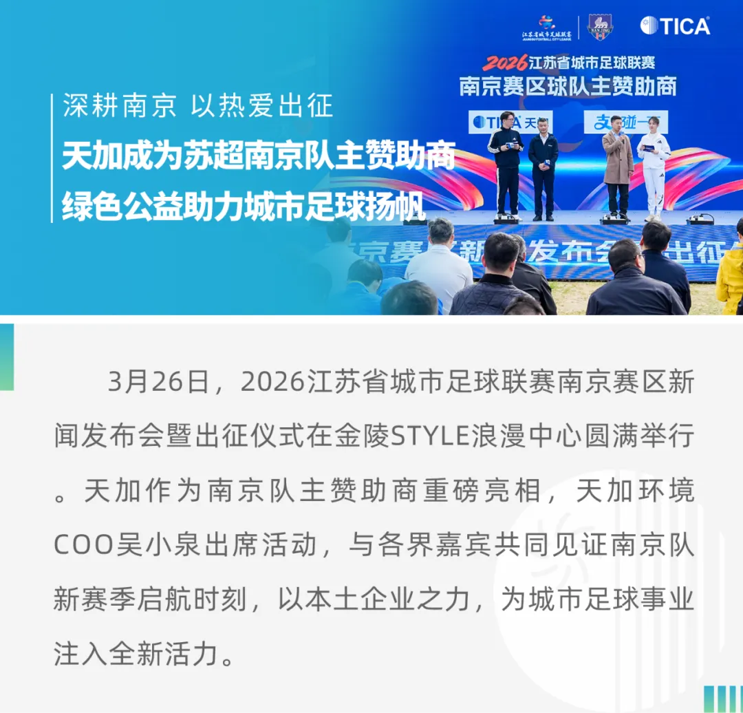 出征的号角已经吹响,2026苏超南京队即将踏上新赛季征程。天加将秉持长期主义,以绿色为底色,以热爱为初心,与南京队并肩作战,持续推进绿色球场、青少年足球扶持等计划,在助力球队斩获佳绩的同时,为南京城市体育文化发展贡献天加力量,携手共绘城市足球发展的崭新画卷!