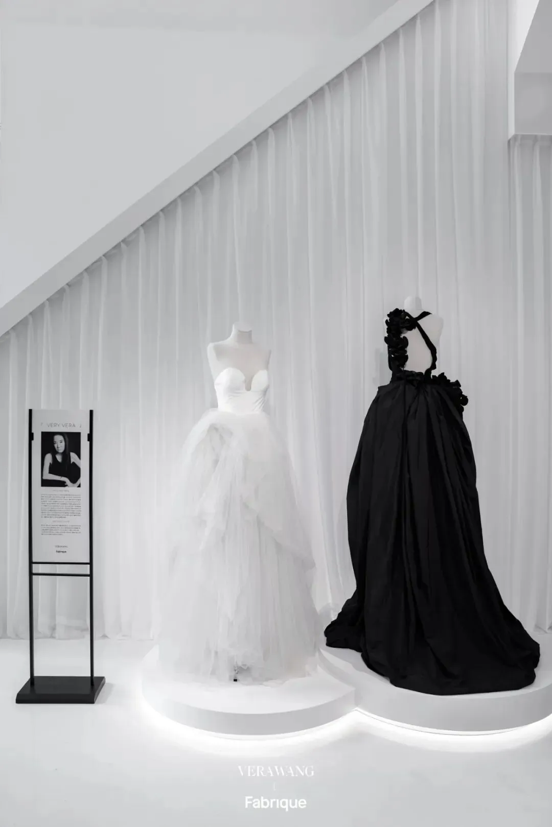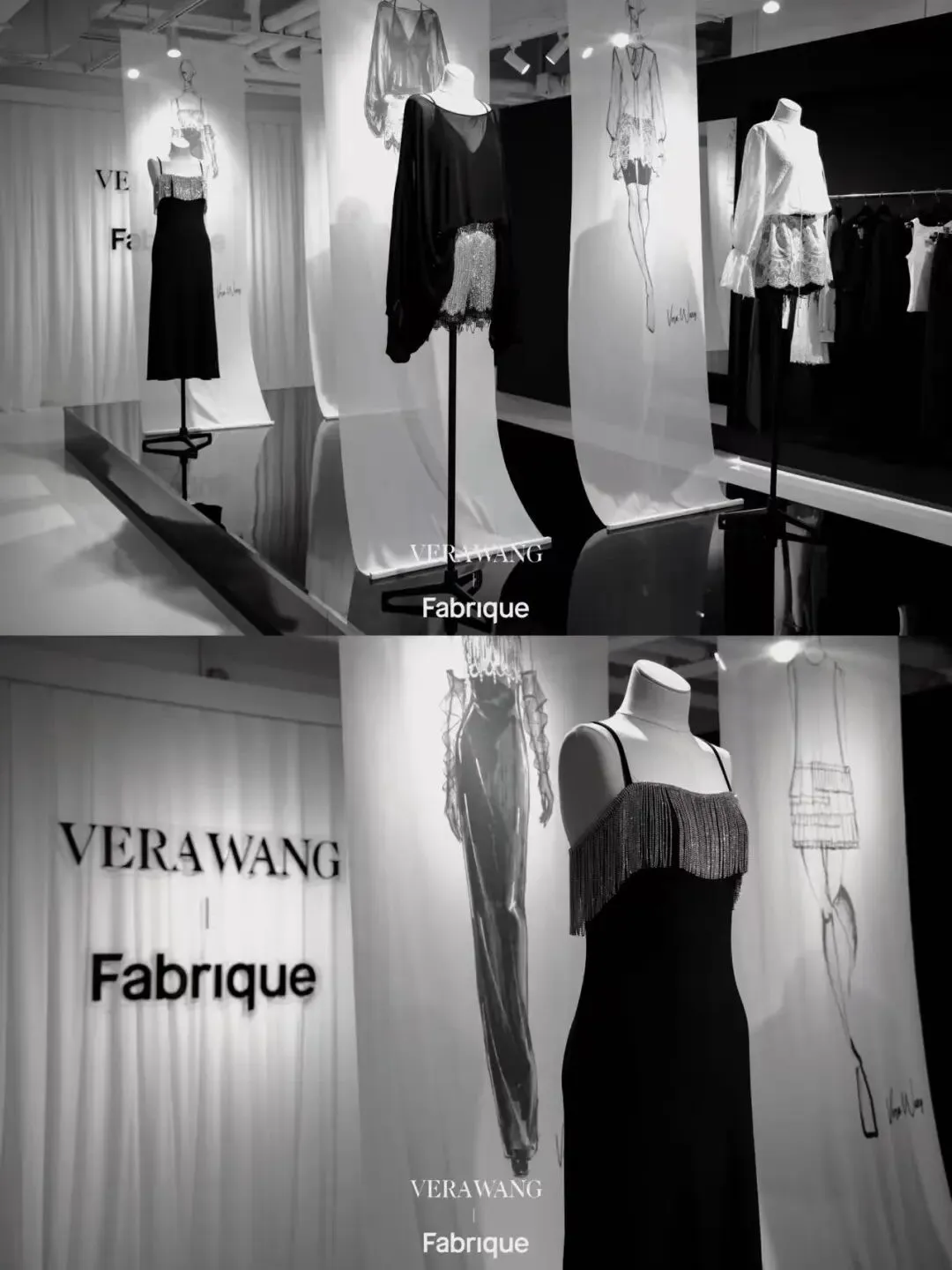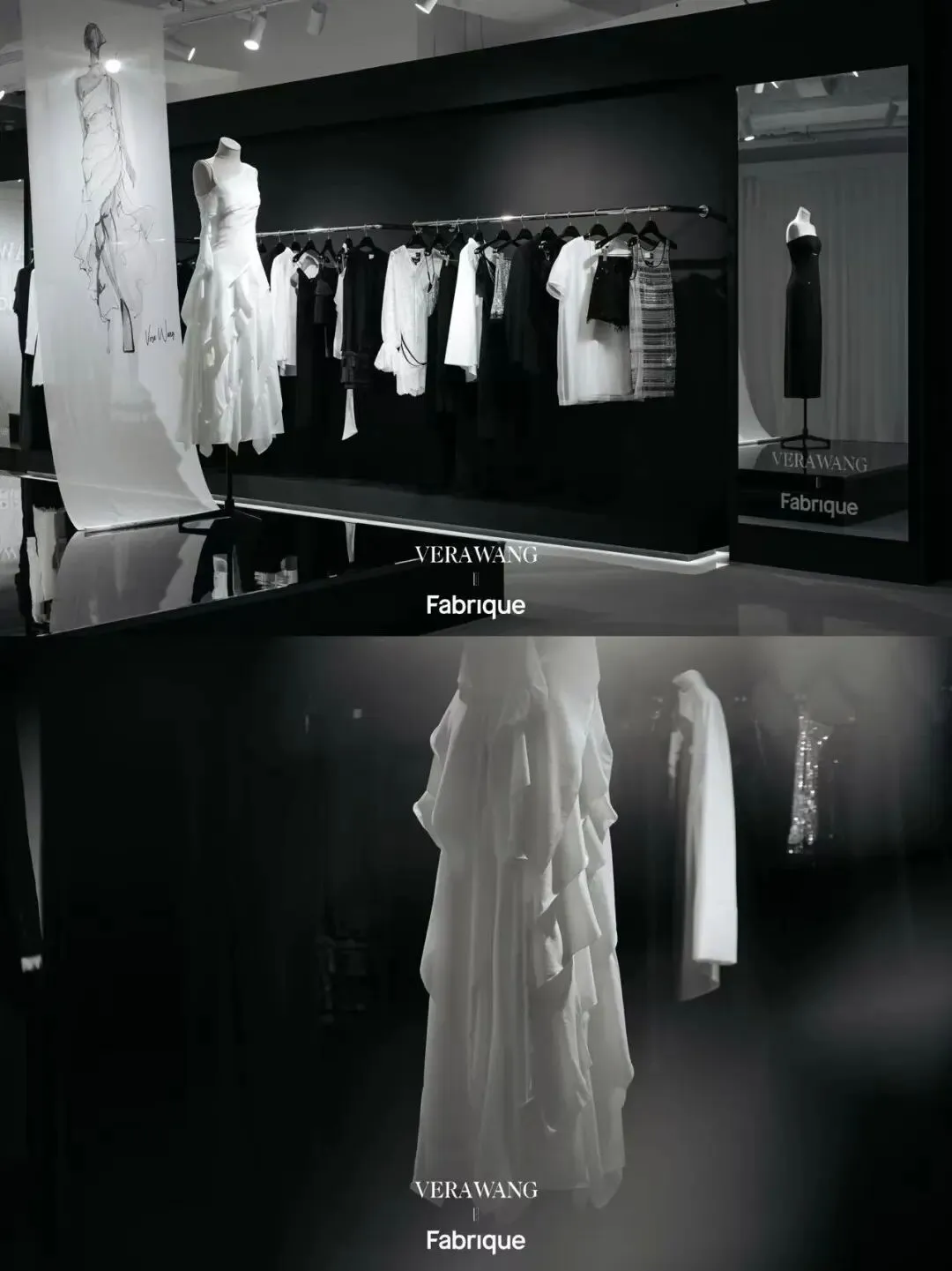 二层以纯粹黑白色系铺陈视觉基底,打造先锋设计与当代生活的交汇之所。空间完整呈现 Fabrique x Vera Wang 全系列37件联名服饰,部分设计手稿亦于其间静默展陈。穿行于灵感草图与成衣落地的创作脉络,近距离感受质感肌理——殿堂级设计,至此融入日常。
