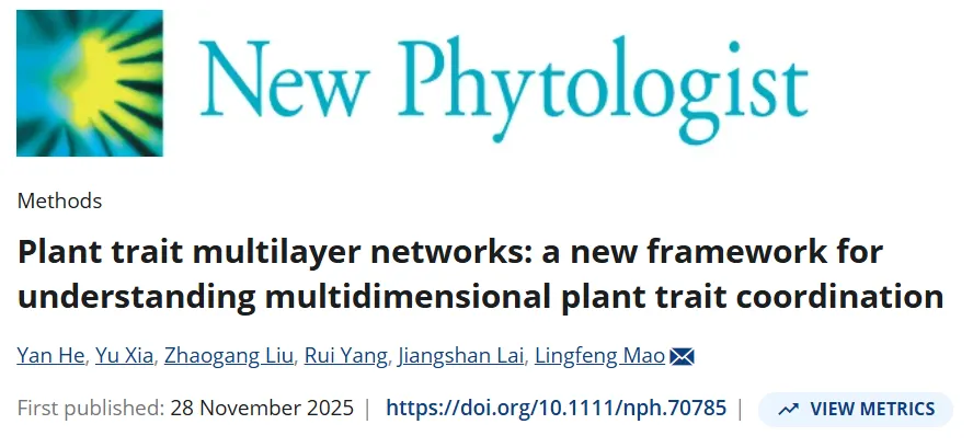 近日,南京林业大学生态与环境学院“生物多样性与生态保护”毛岭峰教授课题组在植物学经典期刊《New Phytologist》发表题为“Plant trait multilayer networks: a new framework for understanding multidimensional plant trait coordination”的最新研究成果(论文链接:https://doi.org/10.1111/nph.70785)。生态与环境学院博士生何雁为论文第一作者,毛岭峰教授为通讯作者,南京林业大学赖江山教授、刘召刚副教授、博士生杨睿和硕士生夏雨为共同作者。研究得到了国家重点研发计划项目(2023YFF0805800)和江苏省社会发展项目(BE2022792)的资助。