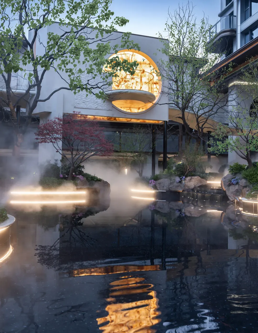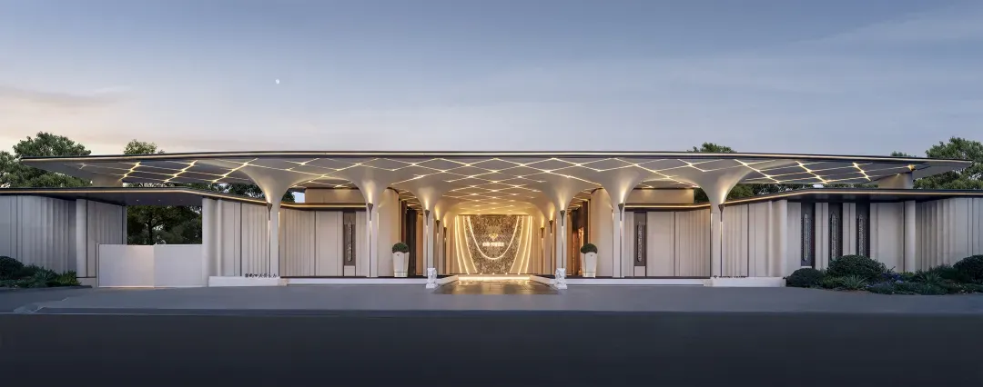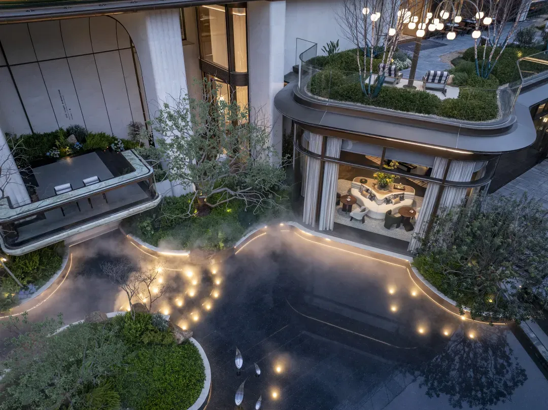 用材也狠:顶部古铜色铝板+中间灯带+底部UHPC的三层设计,UHPC相当罕见,阿布扎比卢浮宫同款,能扛百年;主景墙雪山蓝奢石,孔雀开屏纹理,配着水流往小区淌——水主财,这叫财气内聚。大门两侧墙面还嵌了亚马逊绿奢石,万元每平起步。典雅,但不端着,是真舍得。