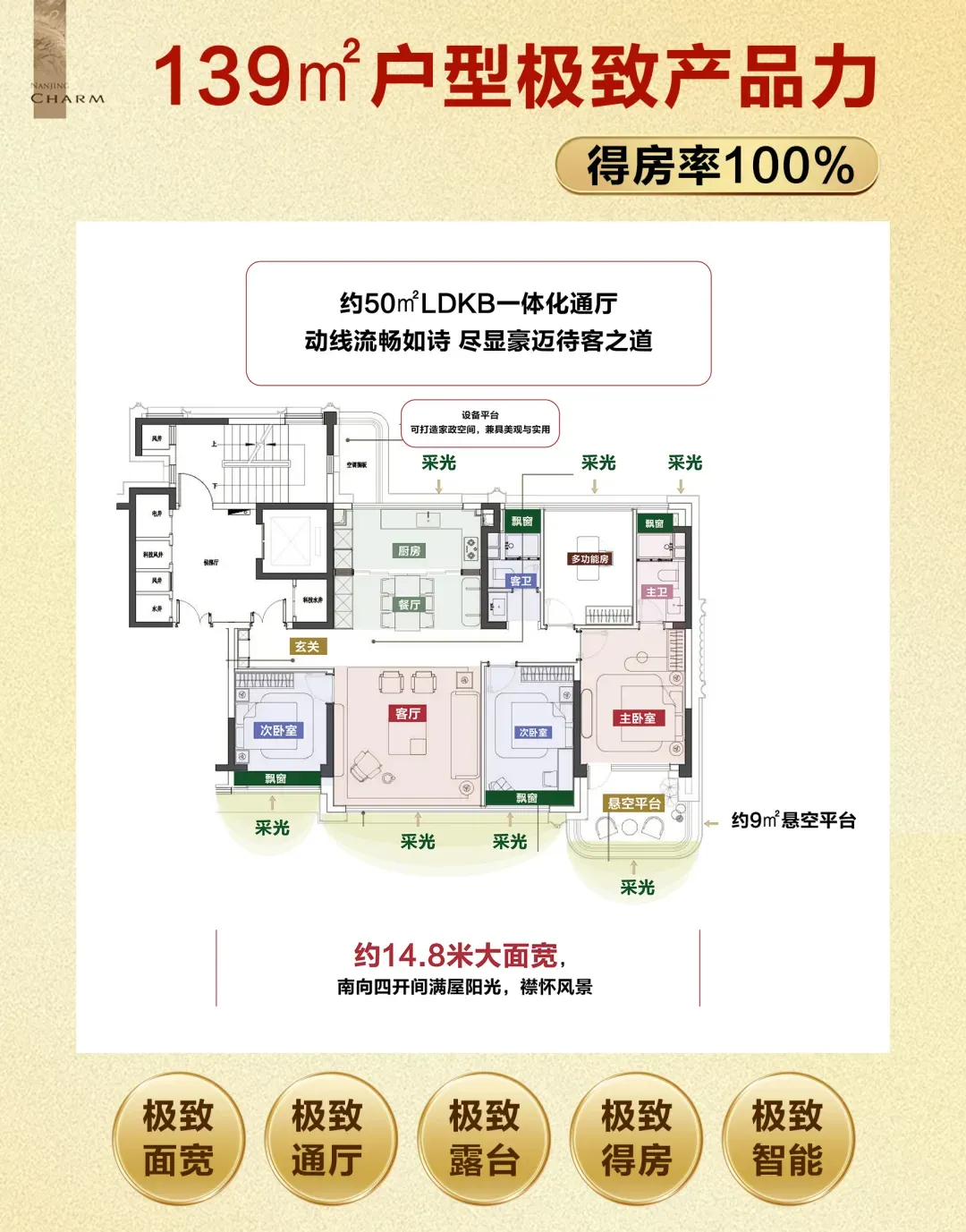 此次首开的是139㎡户型,得房率100%,尺度感直接对标传统160㎡户型。
