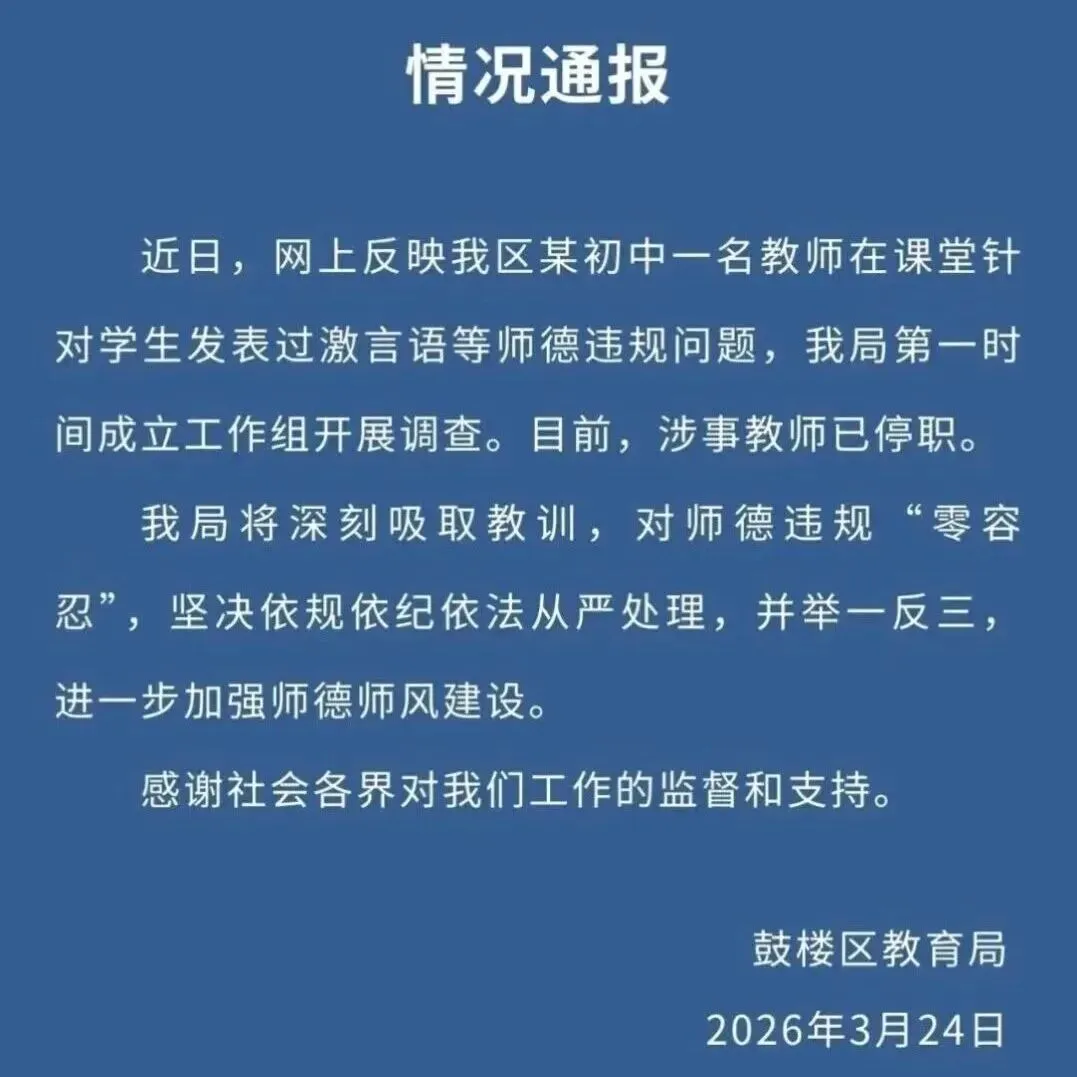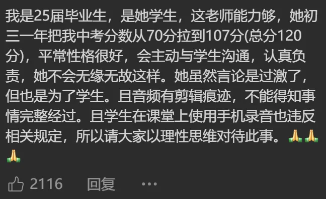几乎所有人包括我自己在介入关于这一事件的讨论时都带有预设的立场和判断,因为我们都经历过学生时代。无论是在成长过程中因严厉但负责任的老师而受益的或是受贬低辱骂学生的老师之害的人,都会代入自己的主观视角,进而对事件产生自己的判断。所以我们需要的不是反对、批判老师或支持、声援老师的站队,而是关注客观事实(包括语境下的真实),并在我们了解全貌之前保持克制。