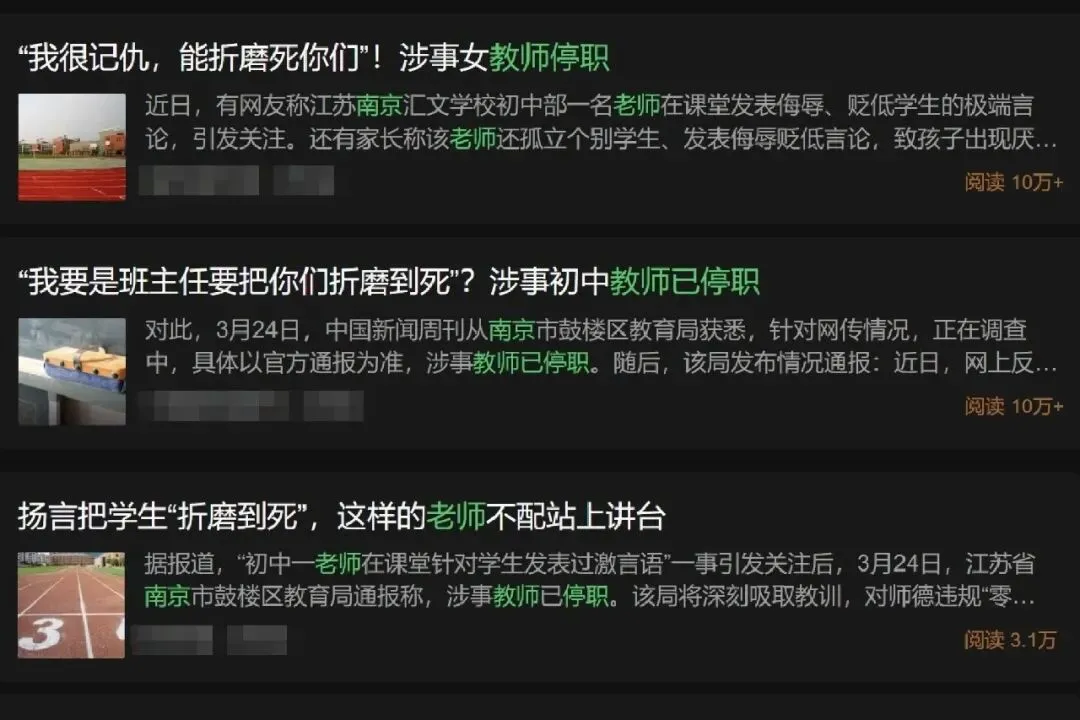 其二,媒体对录音的转述暴露了媒体可能并没有尽到核实的责任。在存在两种解读(“我把你们折磨”和“我被你们折磨”)的情况下,大量视频与文章将模糊的不确定的音频采取了确定性的报道,并选择了最恶劣的解读方向,用“老师‘扬言’折磨学生”这样的明显带有主观色彩的措辞以及将录音中在不同语境下的两句话(“记仇”和“折磨”)放在一起的拼接,用“强势的老师压迫、威胁弱势的学生”的叙事框架,追求标题的冲击力(即使是下意识的行为)。