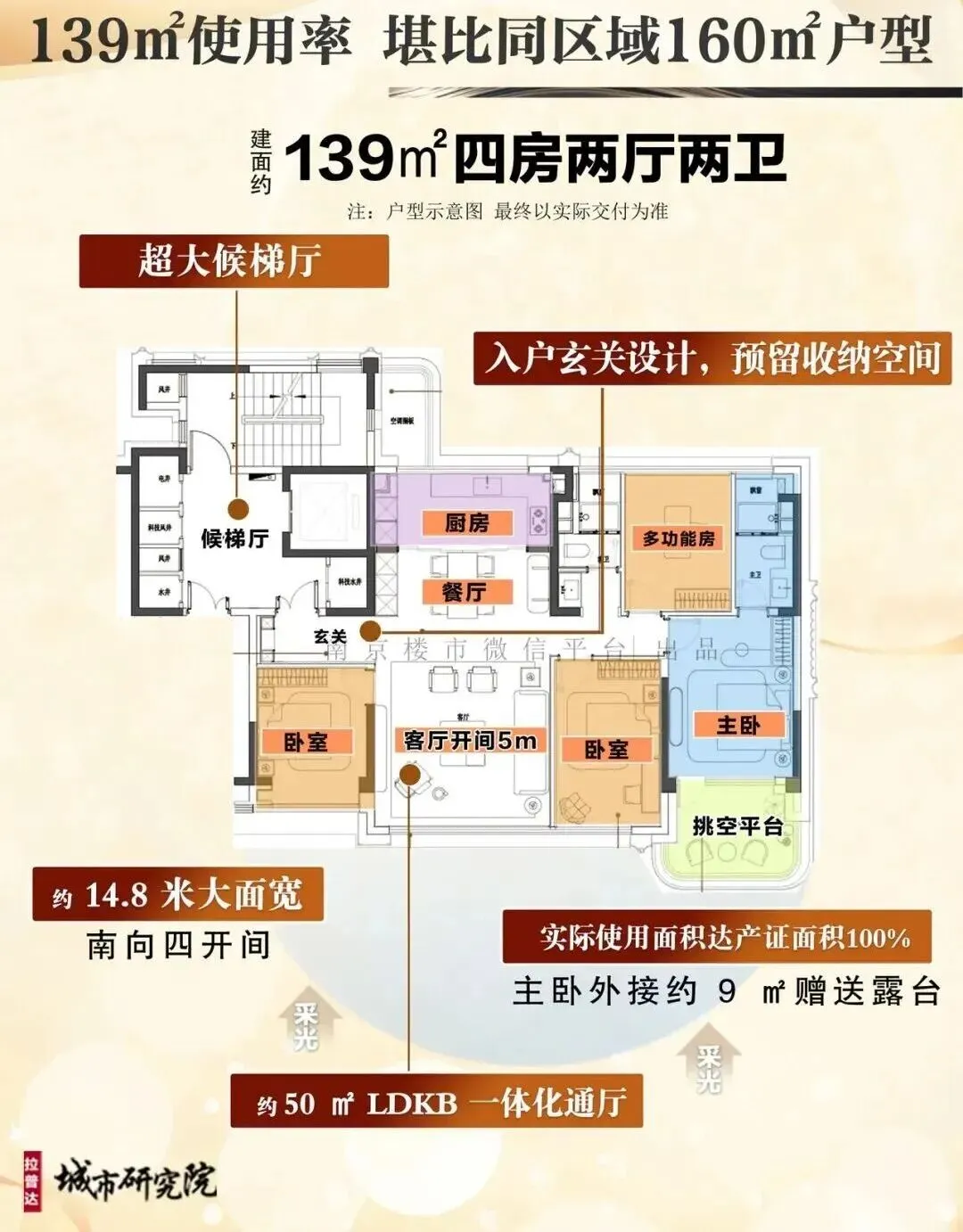 宽境采光,通透格局:约14.8米南向四开间,采光面拉满;约50㎡LDKB一体化通厅,将客厅、餐厅、厨房、阳台联动,形成开阔的家庭核心区,社交与生活场景能够自由切换