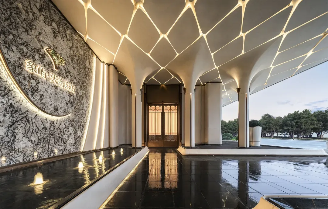 第一境是大门,约82米的超长展示面,52米的形象大门巍峨耸立。基座用的是保加利亚维纳多天然石材,门柱是玉树形飞檐,顶部花瓣采用卢浮宫同款的UHPC高强混凝土。两侧点缀的亚马逊绿奢石,造价万元起步。水向内流,寓意财气内聚