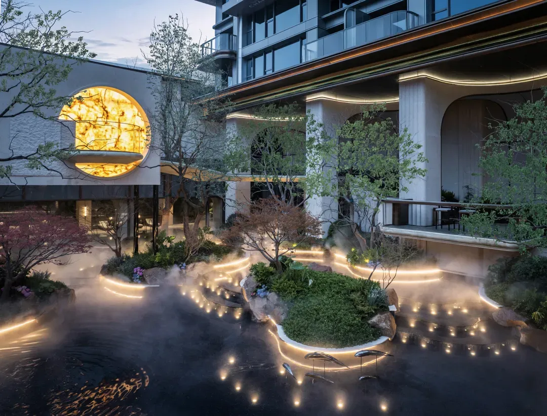 最绝的第四、五境,约1006㎡的水面,49米长的纵深,叠瀑从高处垂落,如云锦般绚烂。拾阶而下,那个约10米挑高的“水月洞天”,以冰川红玉奢石重构月洞门,“天月在地,地月在天”