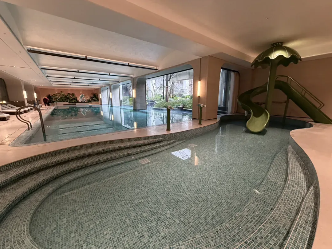 恒温泳池,分成人、儿童两个泳池,儿童戏水池深0.6米,配螺旋滑梯+互动水枪,我已经能想象小孩在这会有多开心了!
